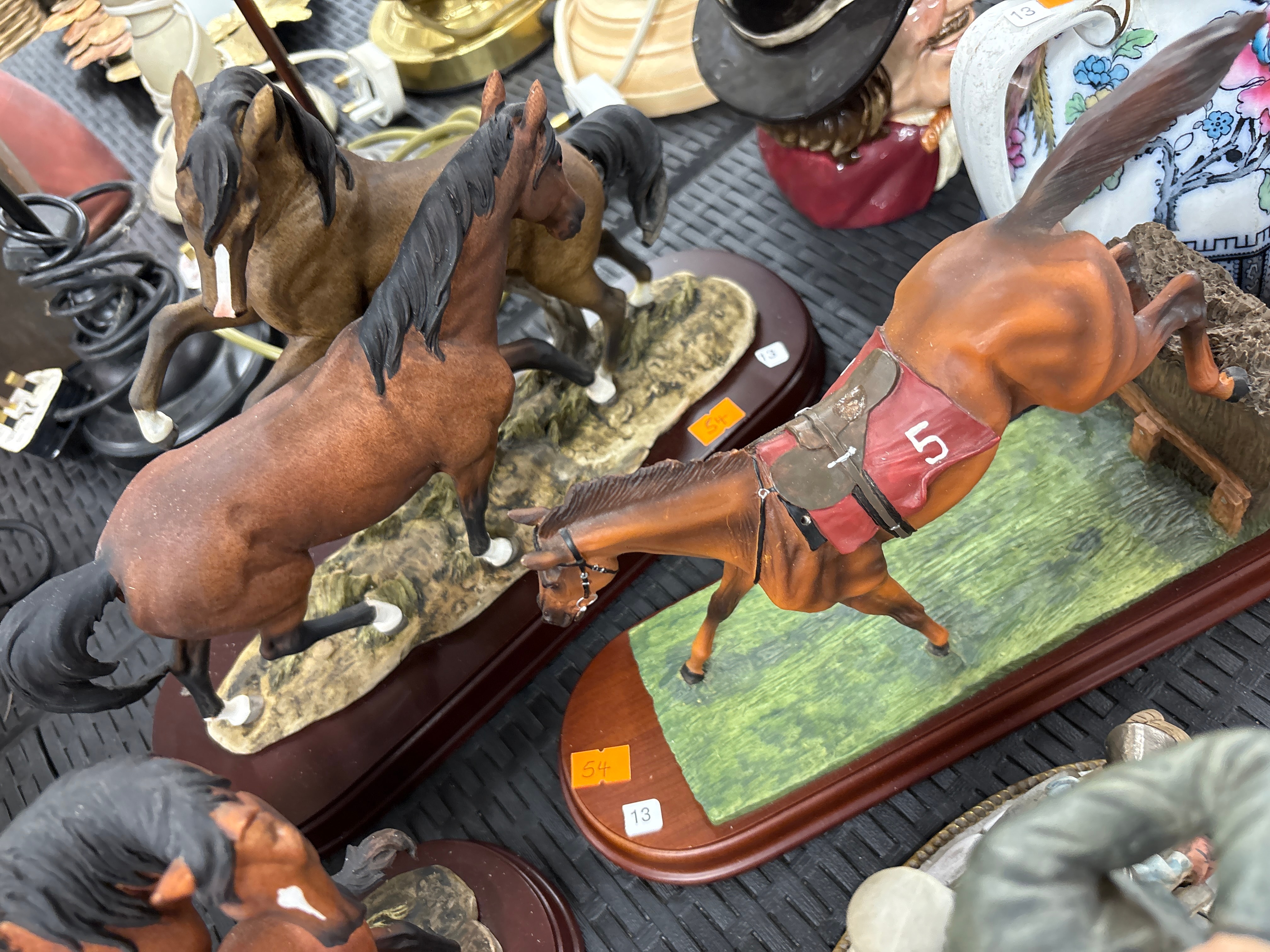 A collection of modern decorative horse figurines, primarily crafted from a material appearing to be resin or ceramic, and finished with a realistic, painted appearance. The group includes a prominent piece depicting a bay mare and foal rearing on a textured, rock-like base, mounted on a dark brown rectangular plinth. Another figurine shows a bay racehorse in mid-jump, wearing a red saddle blanket with the number “5” clearly visible, positioned on a green base simulating grass, also affixed to a dark brown rectangular plinth. White stickers bearing the number “13” are visible on several plinths, alongside orange adhesive labels with numbers “5” and “4”.