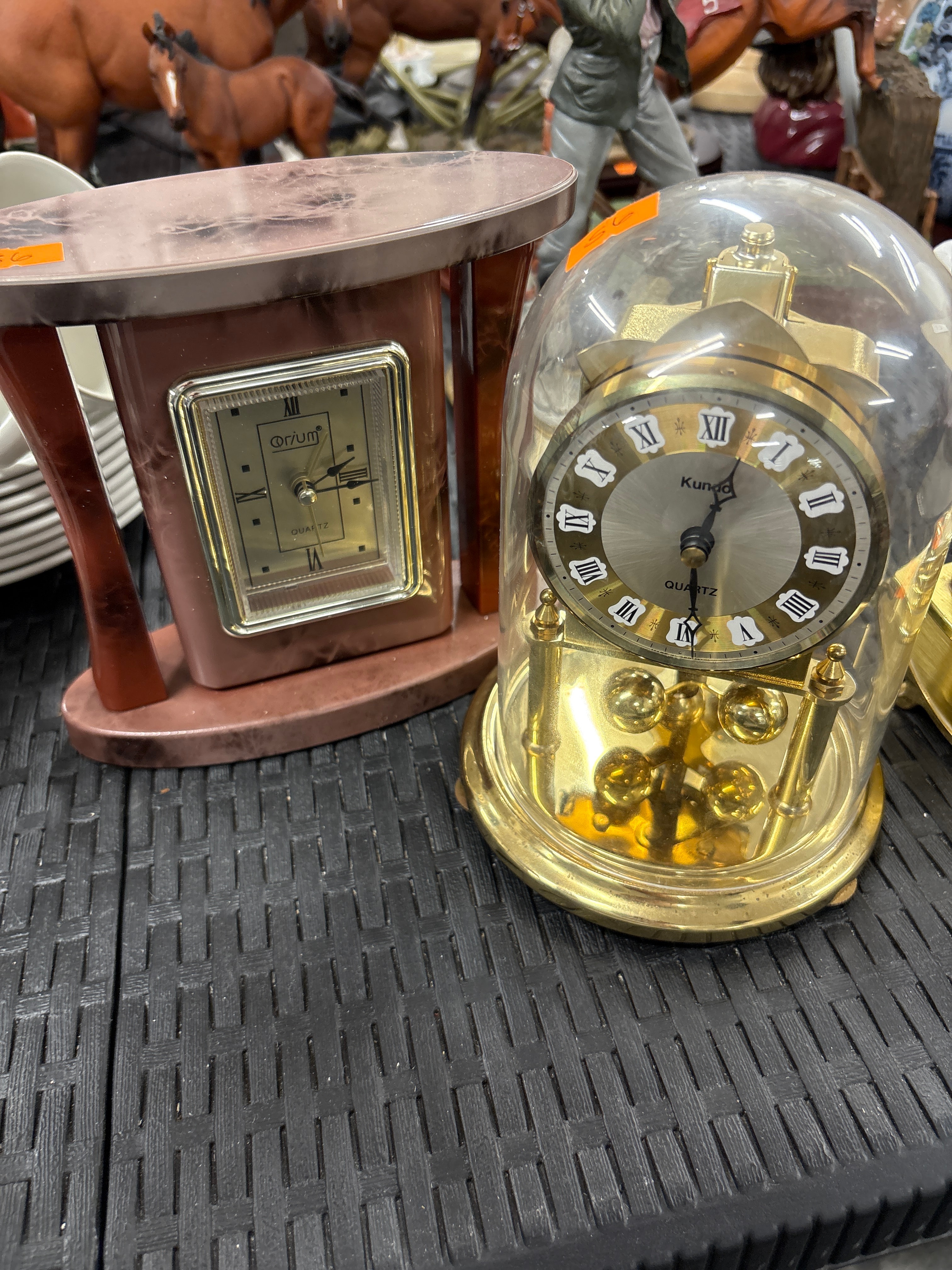 A Kundo quartz anniversary-style clock, featuring a gold-tone metal base and mechanism with decorative rotating spheres, enclosed by a clear plastic or glass dome. The dial is marked ‘Kundo’ and ‘QUARTZ’ with Roman numerals. Accompanying this is a contemporary desk clock with a reddish-brown, possibly wood or plastic, angular stand. It features a rectangular gold-tone dial with Roman numerals, marked ‘Dr/um’ (or ‘Or/um’) and ‘QUARTZ’. Both clocks are fitted with quartz movements.