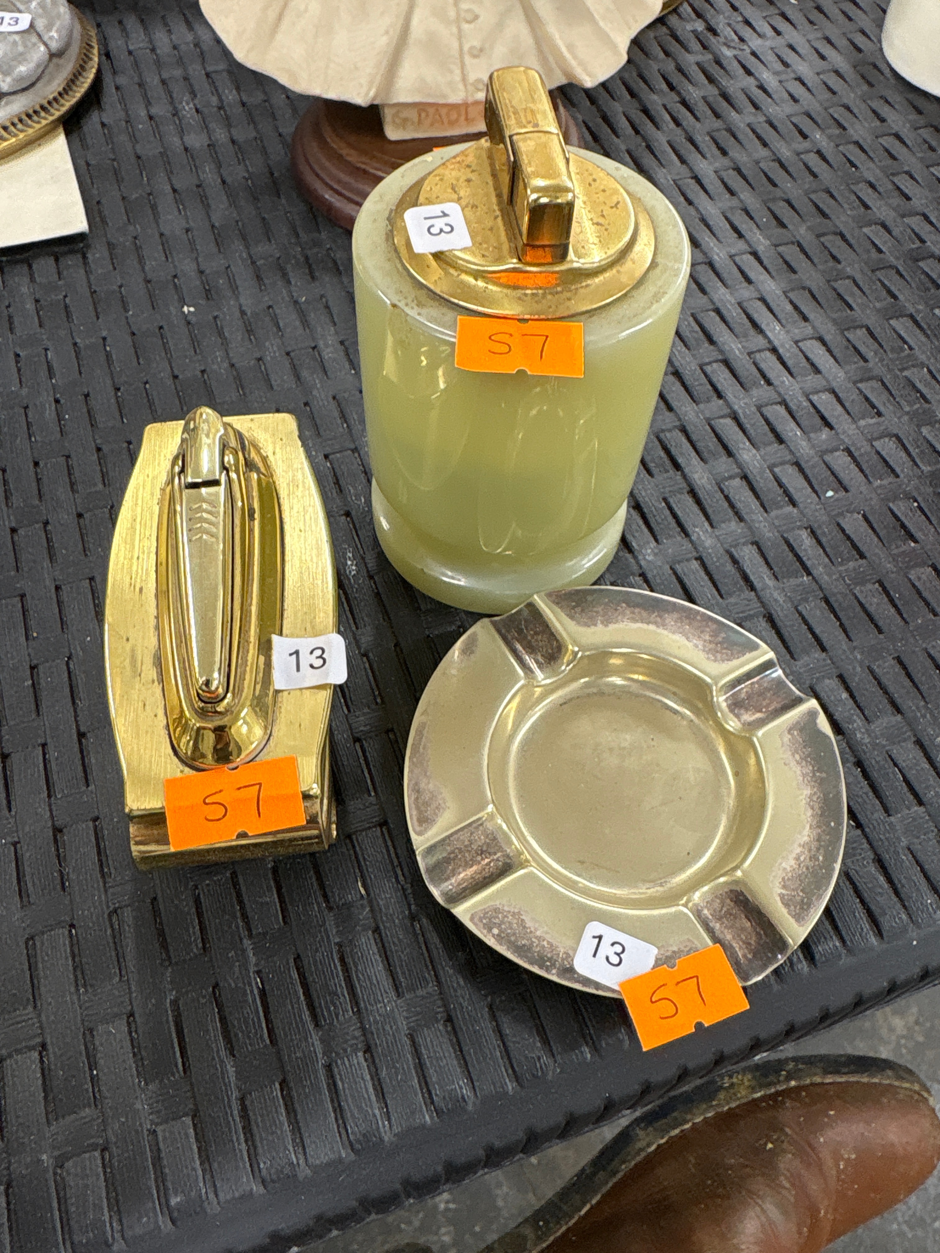 This lot comprises three vintage smoking accessories, likely from the mid-20th century. It includes a streamlined, rectangular table lighter crafted from gold-toned metal, alongside a cylindrical table lighter with a translucent light green onyx or marble body and a brass-toned top mechanism. The set is completed by a round, gold-toned metal ashtray, featuring four cigarette rests. All three items bear white “13” inventory stickers and orange “S7” price tags.