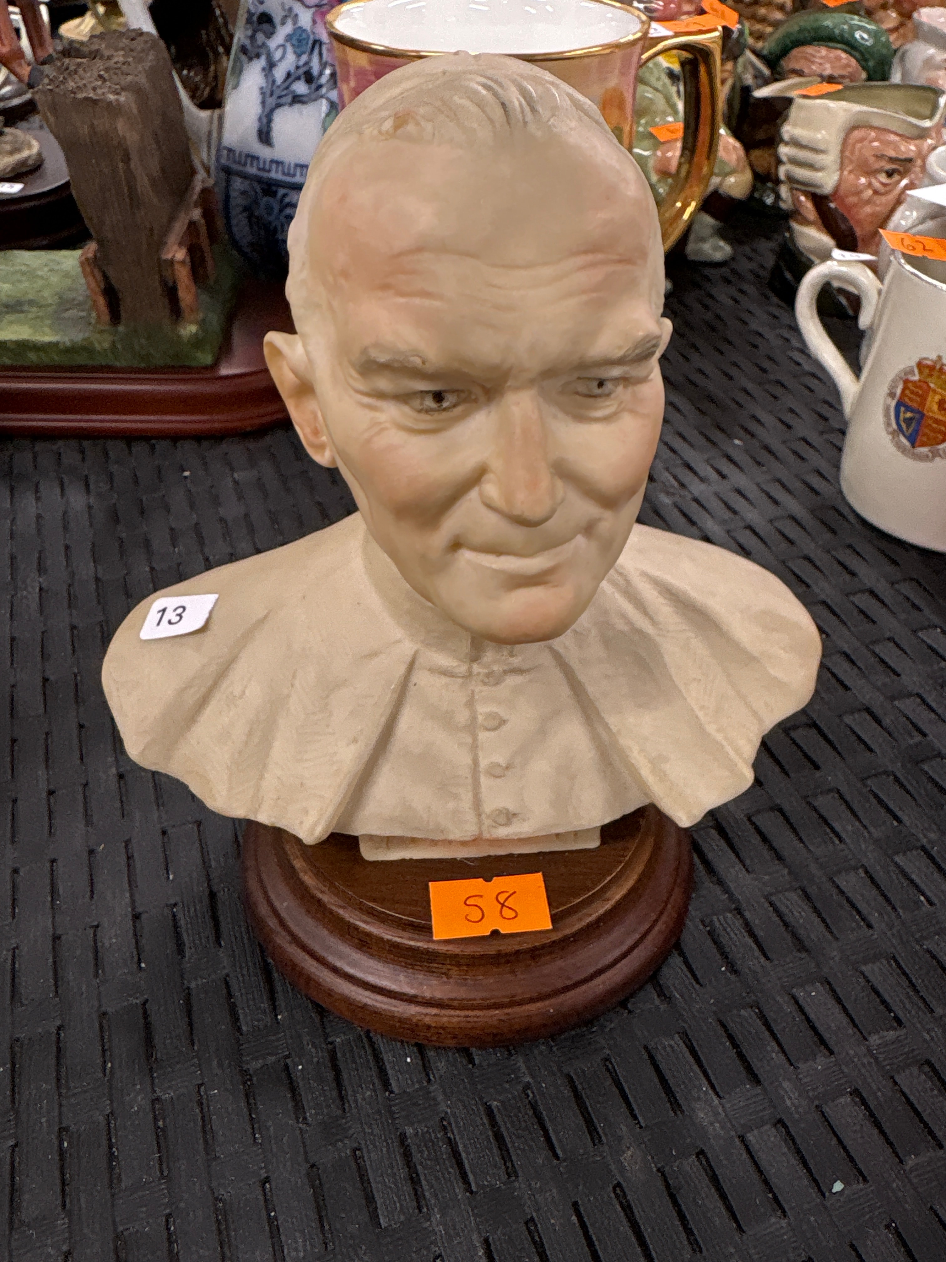 A sculptural bust depicting a realistic portrait of an older male figure with receding hair and a gentle expression. The figure is presented in clerical or formal attire, characterized by a distinctive pleated or ruffled collar and a buttoned front. The bust is crafted from a light-toned material, possibly ceramic or resin, and is mounted on a circular, polished dark wood base. A white sticker marked “13” is present on the figure’s left shoulder, and an orange sticker marked “58” is affixed to the wooden base.