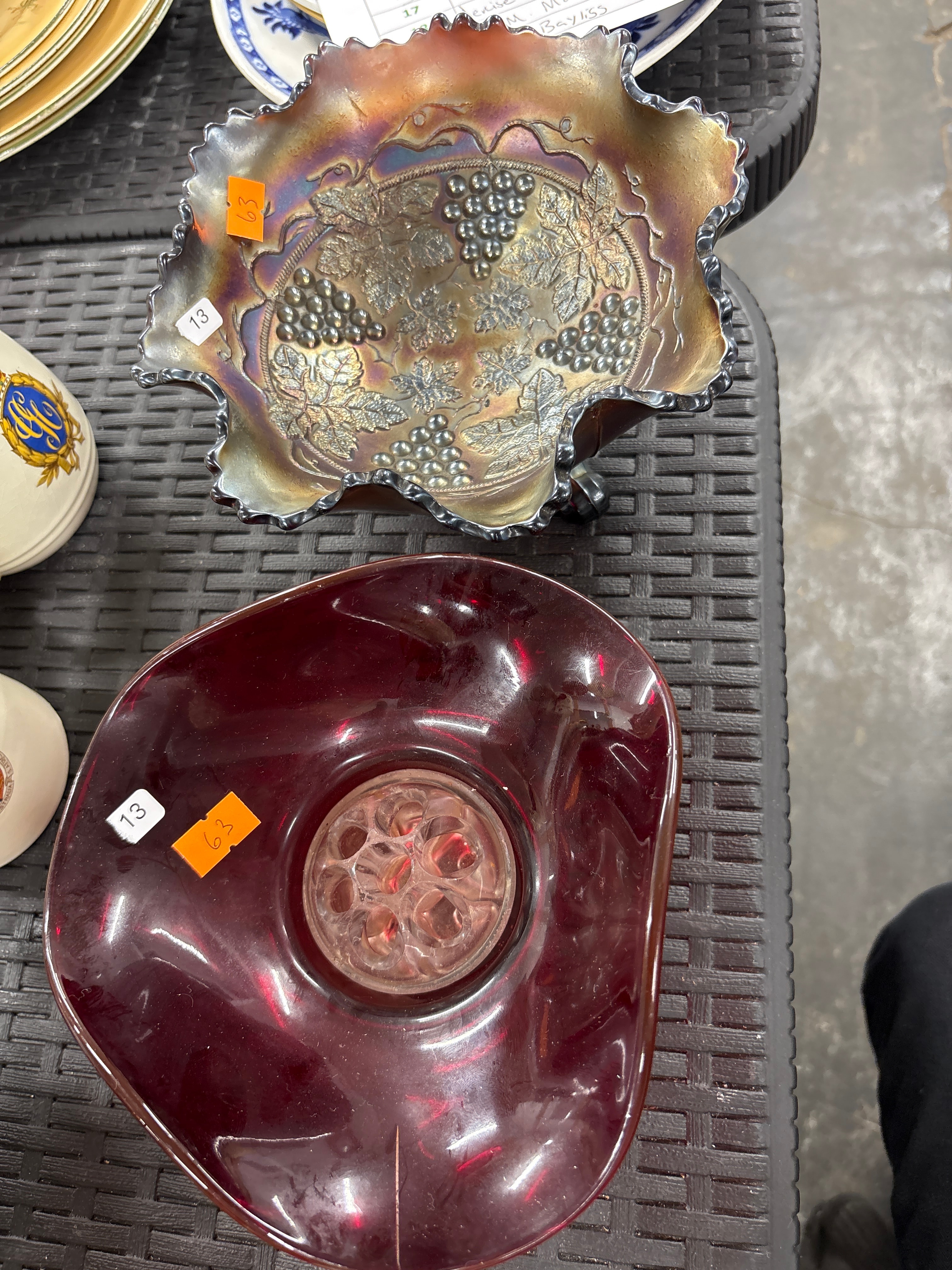 A pair of decorative glass items. The first is an iridescent pressed glass bowl, likely Carnival Glass style, featuring a ruffled edge and an elaborate embossed pattern of grape clusters and vines. The iridescence displays a vibrant golden-amber to purple and blue sheen. Accompanying this is a deep ruby red glass flower bowl with a slightly undulating rim, containing a removable clear pressed glass flower frog with multiple holes. Both items bear auction stickers marked ’63’ and ’13’.