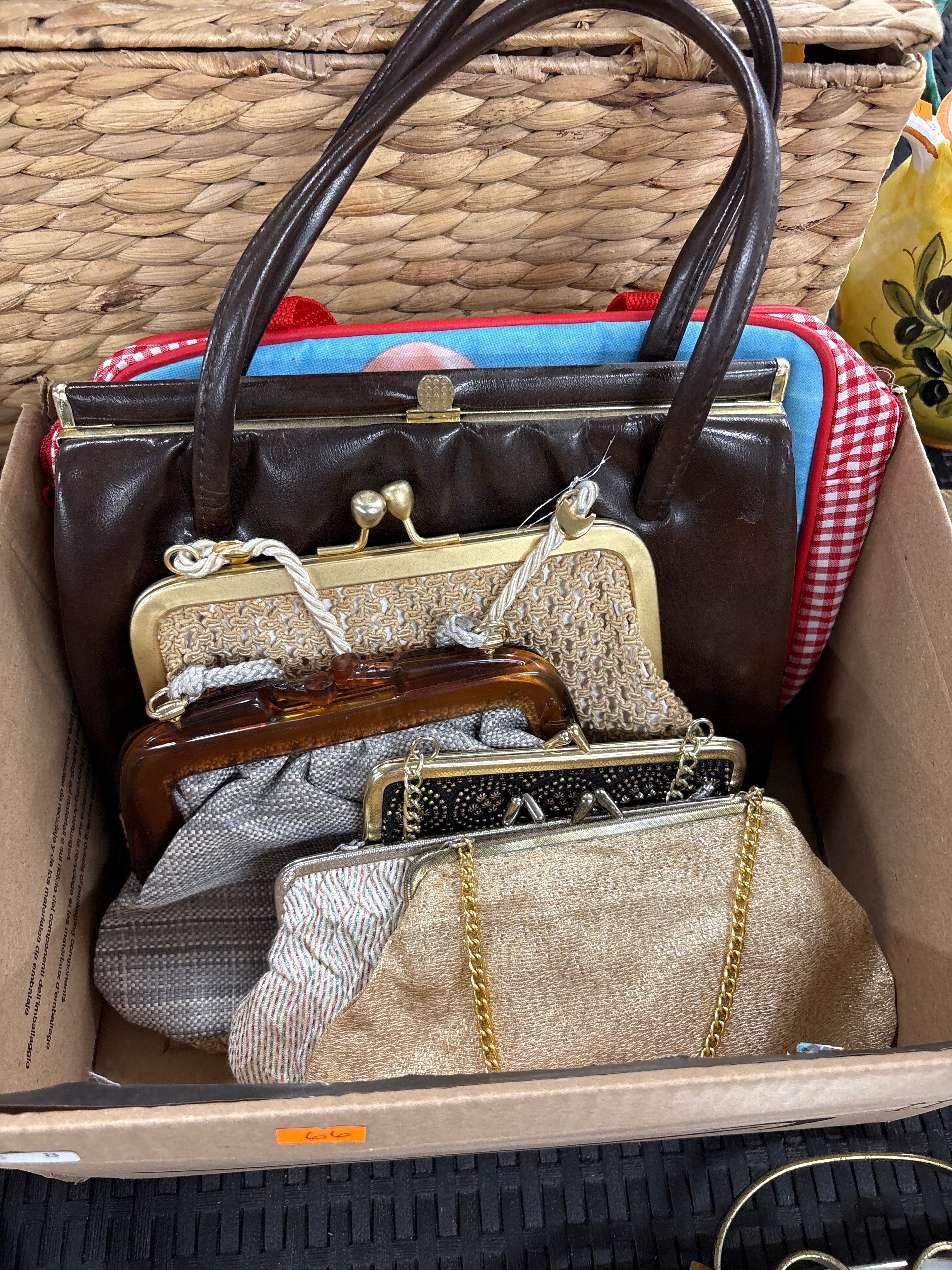 A collection of five vintage mid-20th century handbags and clutches. The primary item is a dark brown, structured top-handle handbag, appearing to be crafted from leather or a faux leather material, featuring gold-tone hardware and a frame clasp closure. Accompanying this are several smaller purses, including a beige crocheted frame purse with a twisted cord handle, a grey woven textile bag with a distinctive amber-colored lucite or bakelite frame, a black patterned clutch with a gold-tone frame and decorative silver-tone elements, and a glittering gold metallic evening bag featuring a gold-tone chain strap. The designs are characteristic of mid-20th century fashion.
