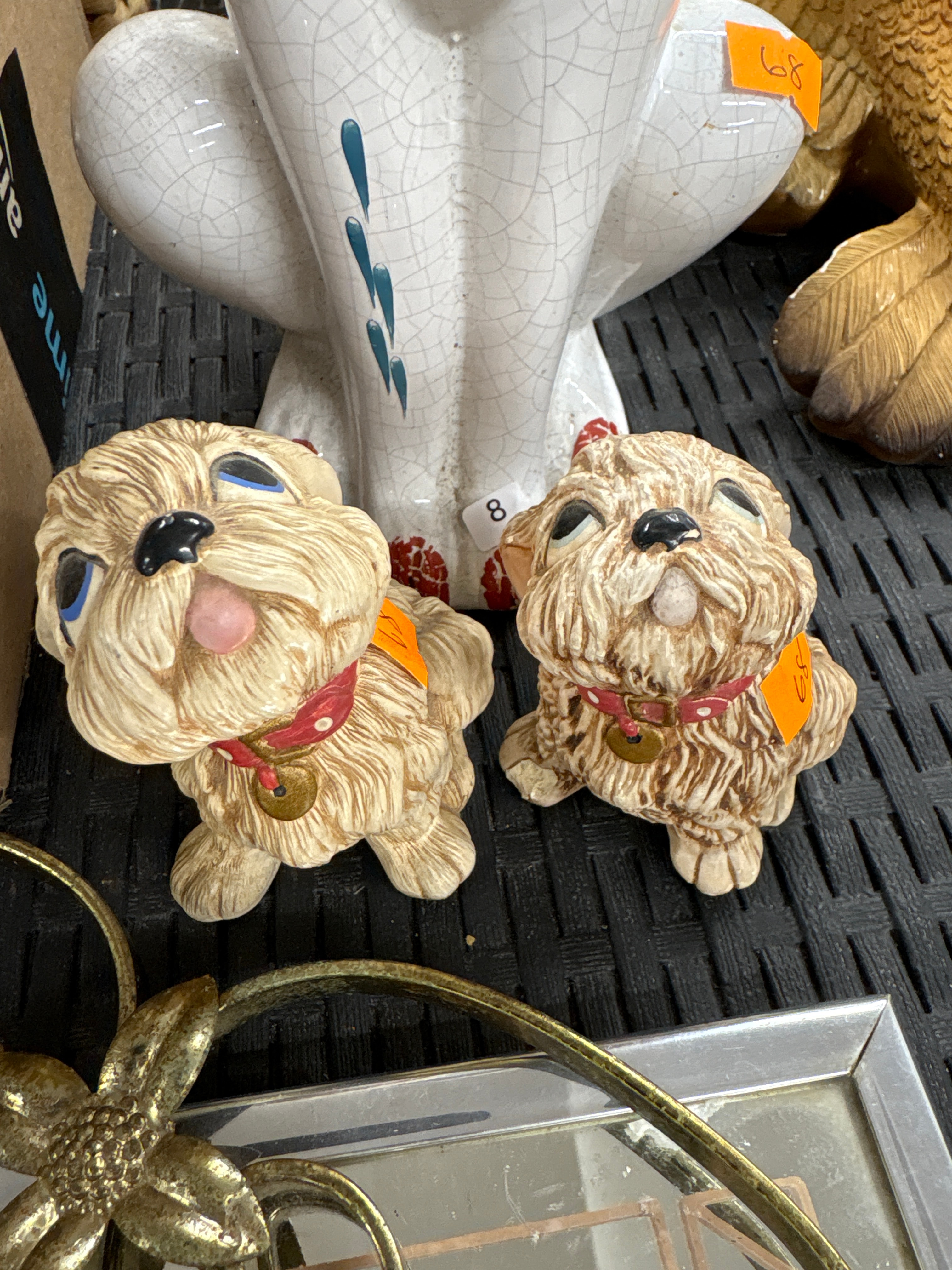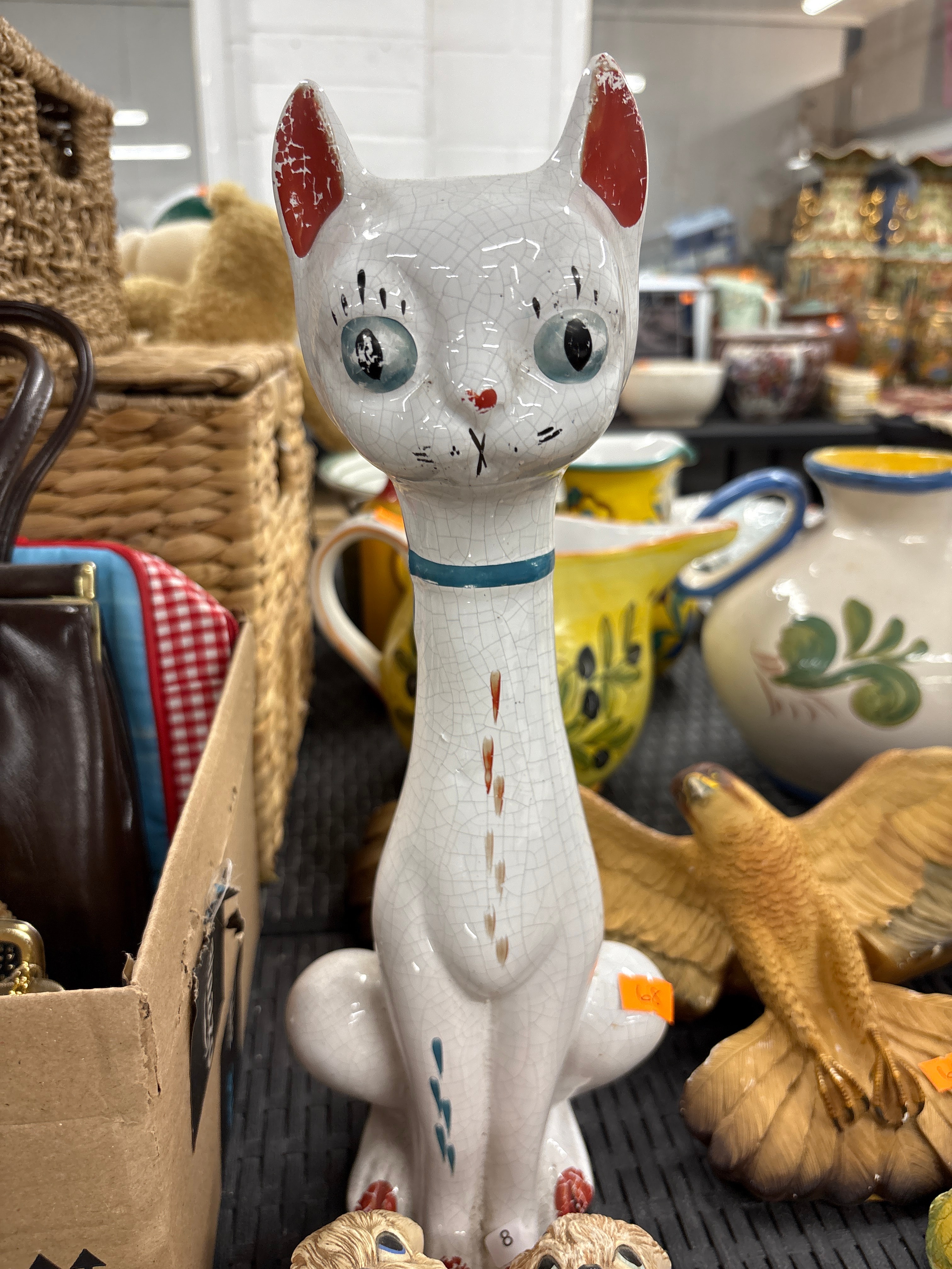 A group comprising two Pendelfin ‘Tammy’ ceramic dog figurines and one stylized ceramic cat figurine. The dog figurines are characterized by textured “fur,” hand-painted features, and open mouths with visible tongues, each adorned with a collar bearing a small metallic charm. The cat figurine is taller and slender, exhibiting a whimsical aesthetic reminiscent of mid-century design, with a long neck, a large head featuring hand-painted anthropomorphic facial features, and a prominent crackle glaze finish with painted accents suggesting texture. All items appear to be in good overall condition, with various orange and white price stickers visible, including a red “8” on a white sticker at the base of the cat and similar “8” markings on the dog figurines.