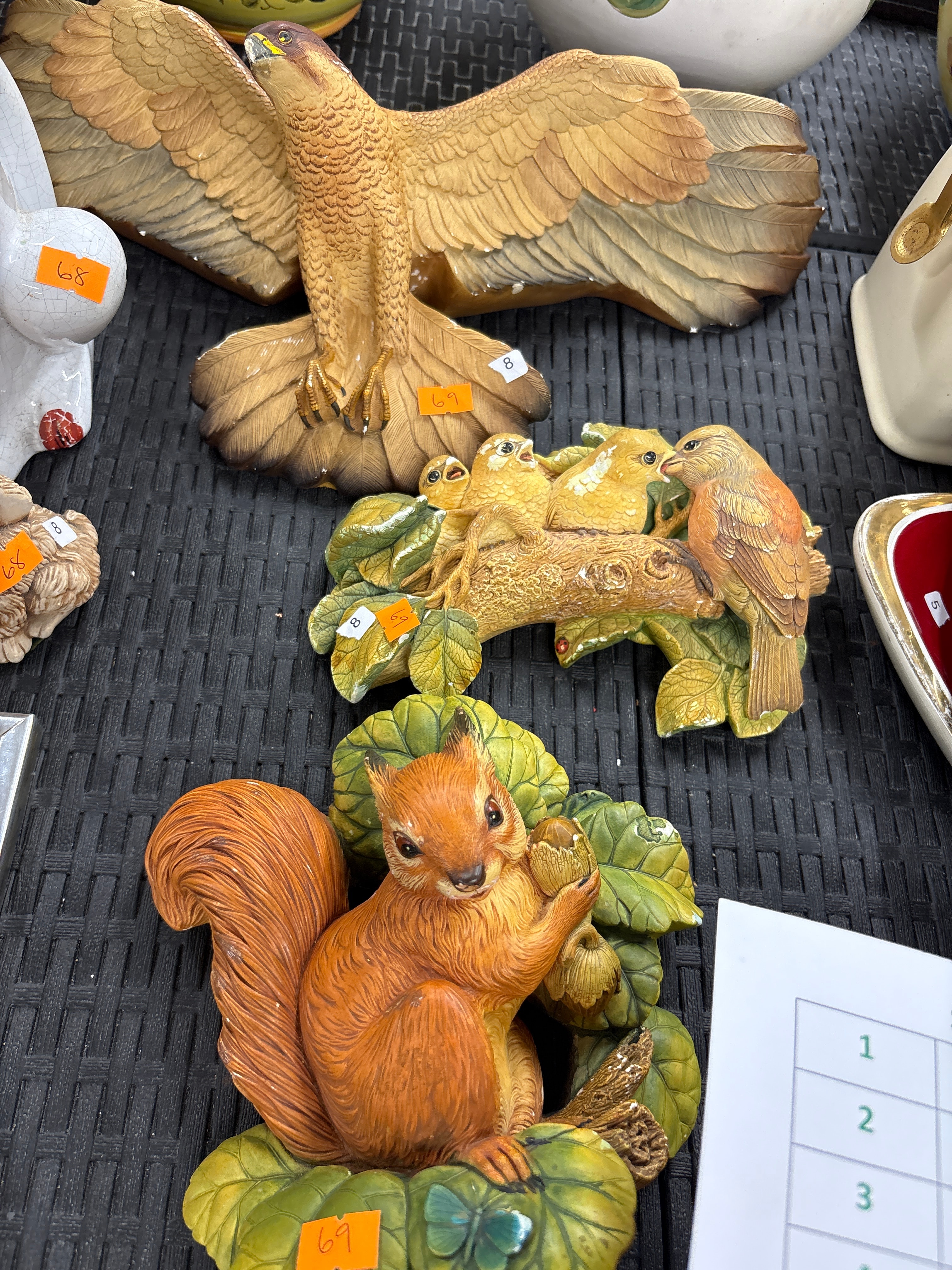 A collection of Bossons Chalkware wildlife figurines, consistent with late 20th or early 21st-century decorative styles. The group includes a large, outstretched brown and tan hawk or eagle, a smaller grouping of yellow-orange fledgling birds perched on a green-leaved branch, and a reddish-brown squirrel holding an acorn amidst green foliage. The naturalistic figurines are crafted from chalkware and hand-painted. Partially visible items include a white crackle-glazed object and a white dish with a gold rim and red interior.