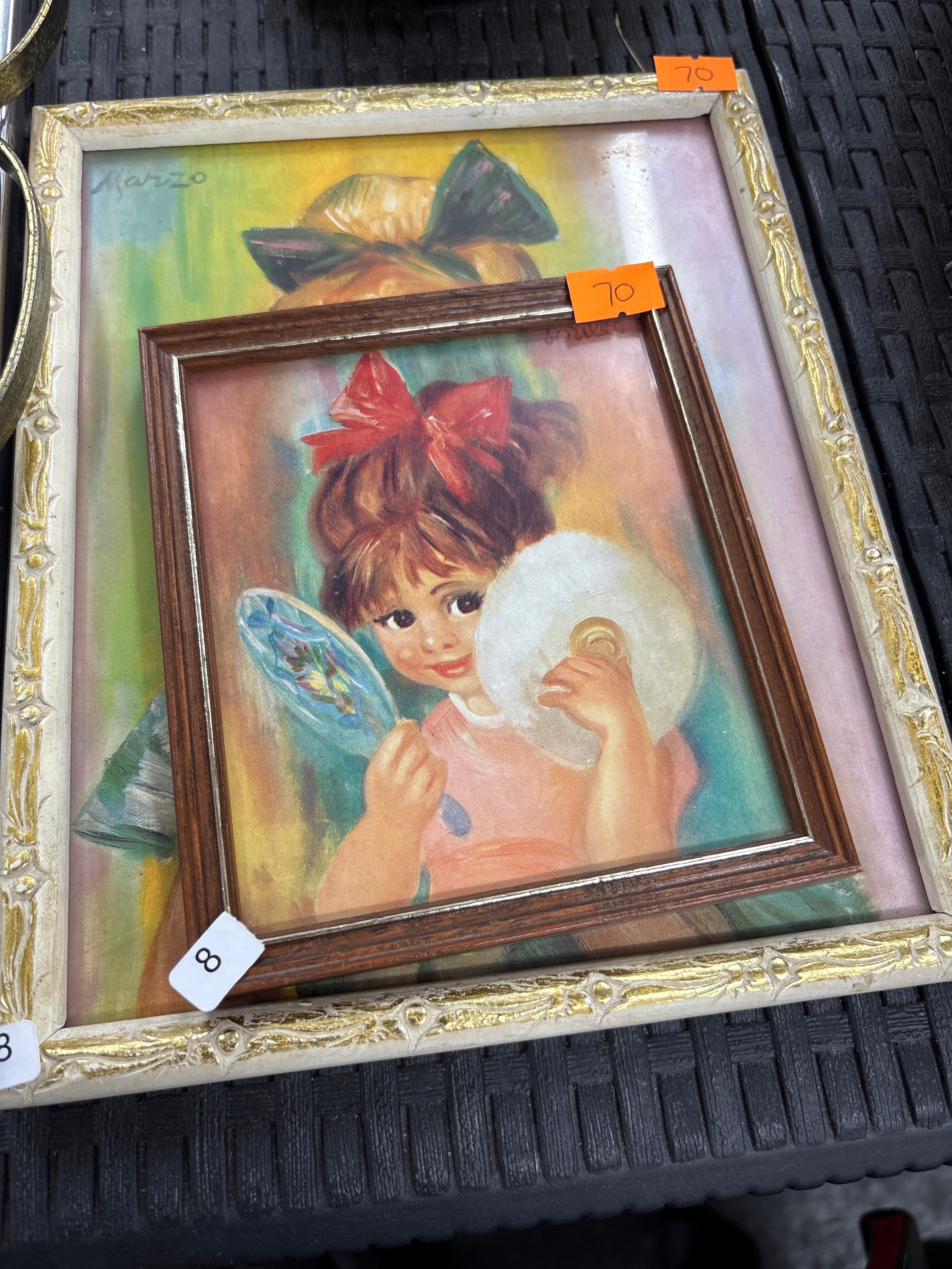 This lot features two framed decorative artworks, likely prints on textured board or canvas, presented in a nested arrangement. The smaller, overlaid piece is a mid-20th-century illustrative portrait in the ‘Big Eye’ style, attributed to Soulet, depicting a wide-eyed girl with a red hair bow, holding a blue fan and a white powder puff. This print is housed in a simpler dark wood frame with a metallic inner trim. The larger background piece features a broadly rendered figure in a hat with a green bow, set against a vibrant, abstract background of green, yellow, and pink, and is signed “Marzo” in the upper left corner. It is housed in an ornate cream-colored wooden frame with gold gilt detailing.