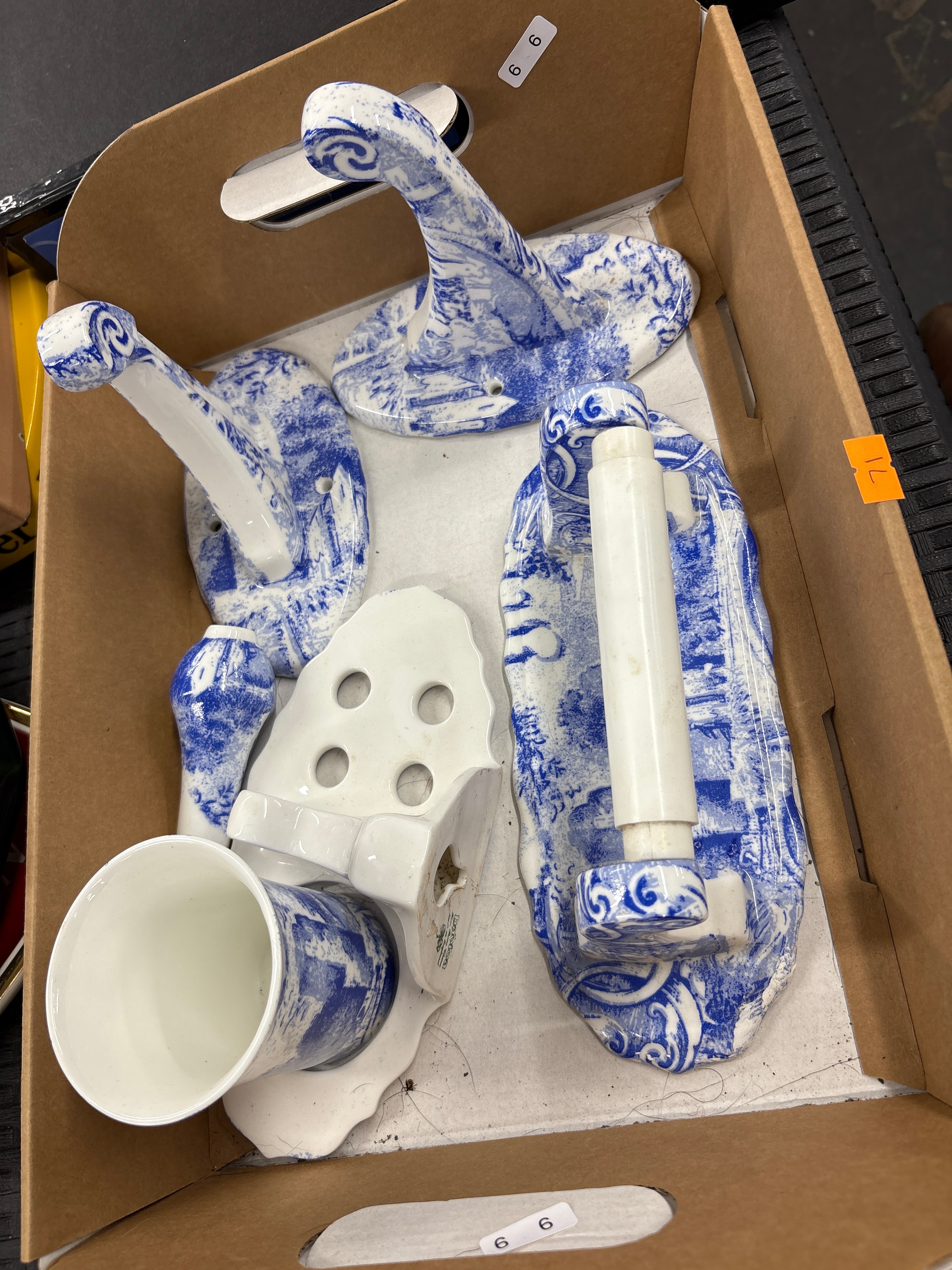 A set of five matching glazed ceramic bathroom accessories, featuring a classic blue and white transferware decoration with scenic or toile-like patterns and scrollwork. The set includes a toilet paper holder, two wall-mounted hooks (one appearing double, one single), a four-hole toothbrush holder, and a tumbler cup. Items are crafted from porcelain or similar ceramic material. The cardboard container holds inventory stickers marked ‘6 6’ and ‘1L’; a faint, illegible green marking is present on the underside of the toothbrush holder.
