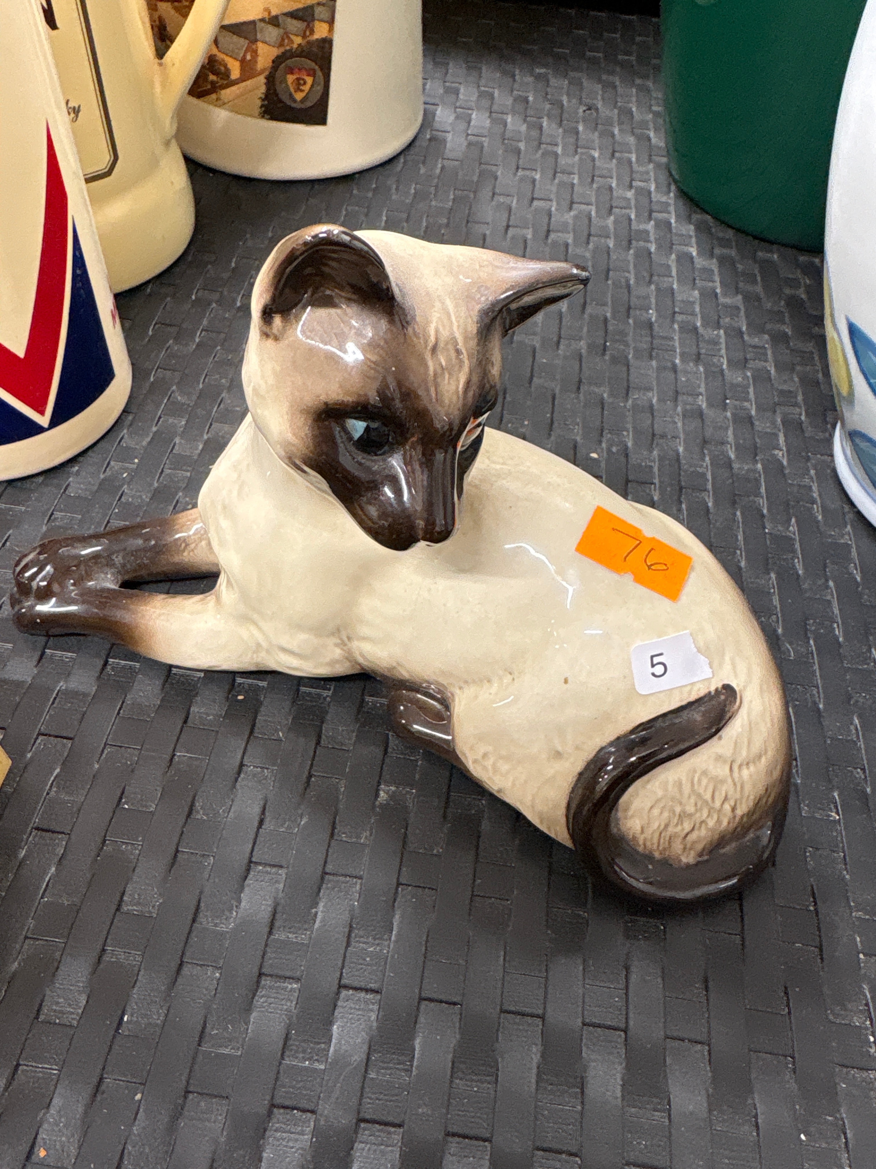 A Beswick Siamese Cat figurine, depicting a Siamese cat in a recumbent, lounging pose with blue eyes and characteristic dark brown “points” on its face, ears, paws, and tail, against a cream-colored body. The glazed ceramic or porcelain piece features a glossy finish. Two price or inventory stickers are visible on its back: an orange rectangular sticker with the number “76” and a white torn sticker showing the number “5”.