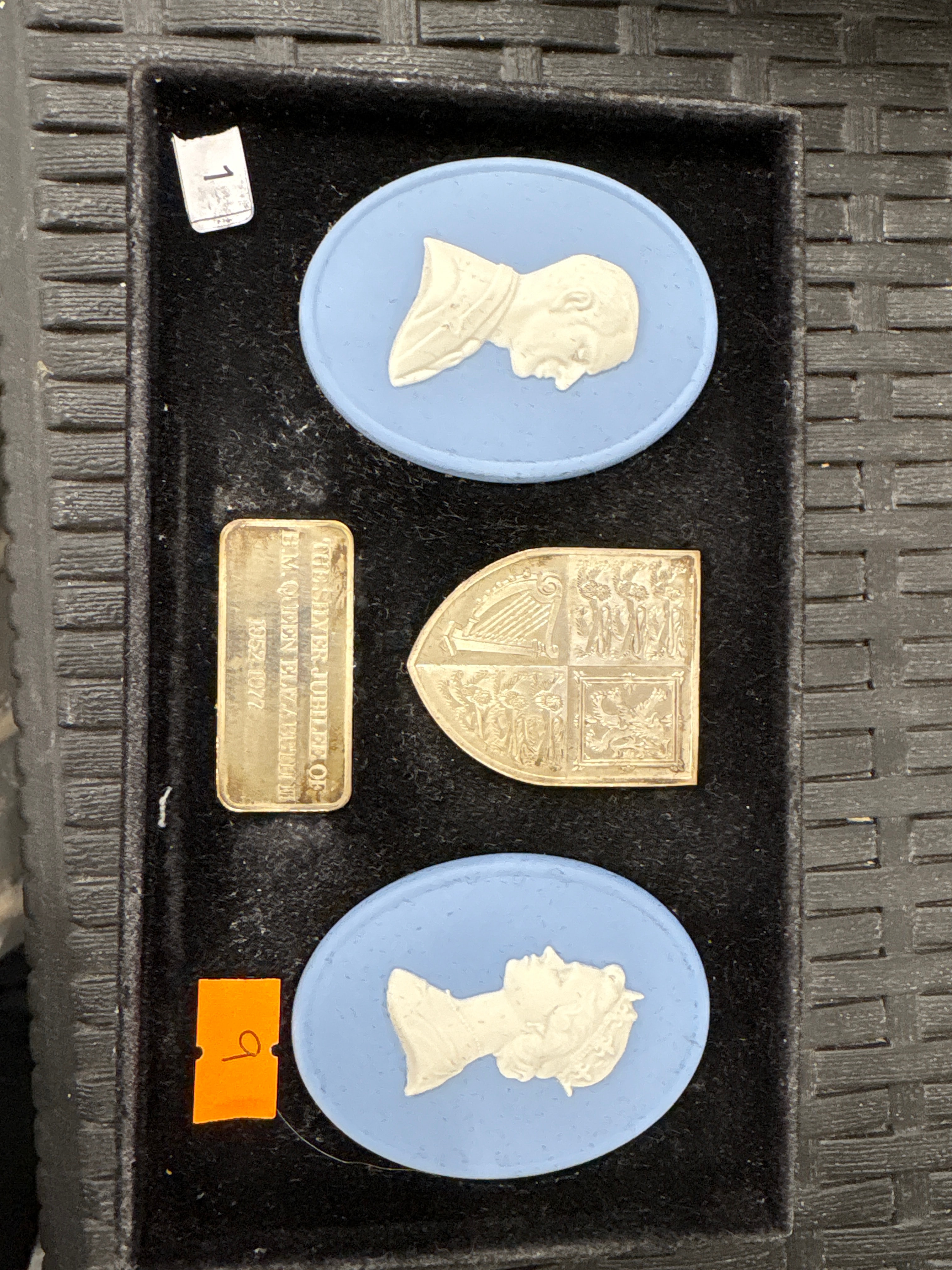 A Wedgwood Blue Jasperware Queen Elizabeth II Silver Jubilee Commemorative Set, comprising four items presented within a dark, possibly velvet-lined tray. The set features two oval cameo-style Jasperware plaques, each with a white classical profile bust on a light blue ground; one depicting a male figure with a helmet-like head covering, and the other a female figure with an ornate coiffure. Accompanying these are two gold-toned metal pieces, identified through web intelligence as sterling silver: a rectangular bar vertically inscribed “THE SILVER JUBILEE OF H.M. QUEEN ELIZABETH II 1952-1977,” and a shield-shaped plaque embossed with a detailed heraldic design consistent with the Royal Coat of Arms of the United Kingdom.