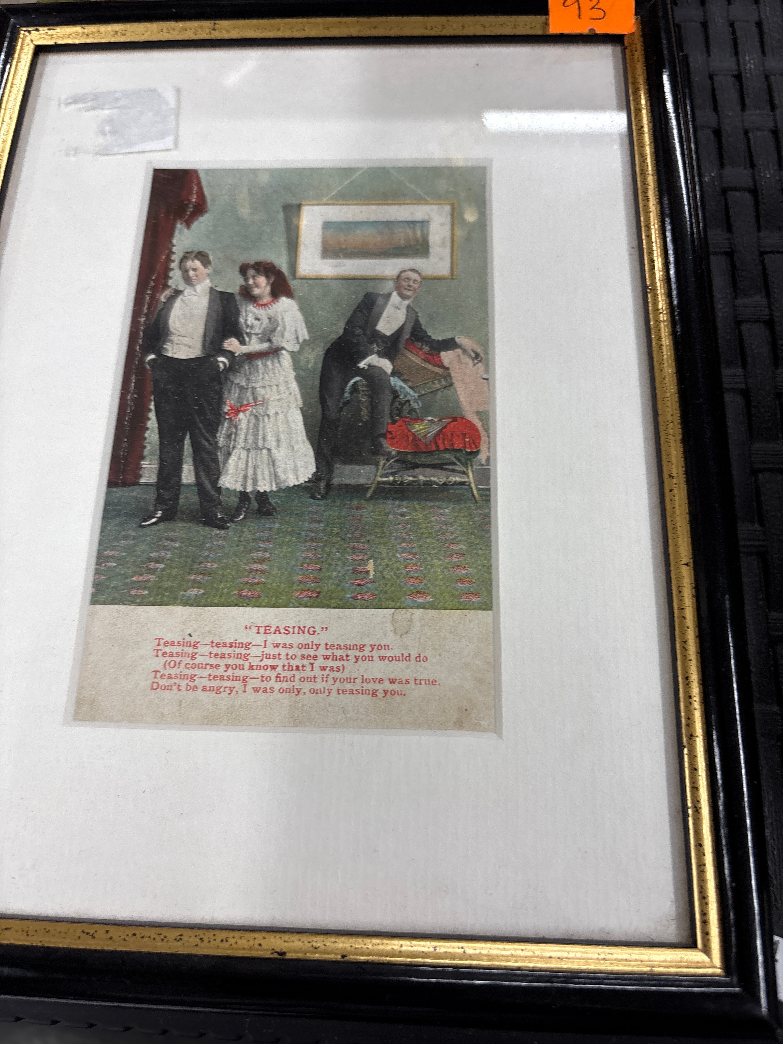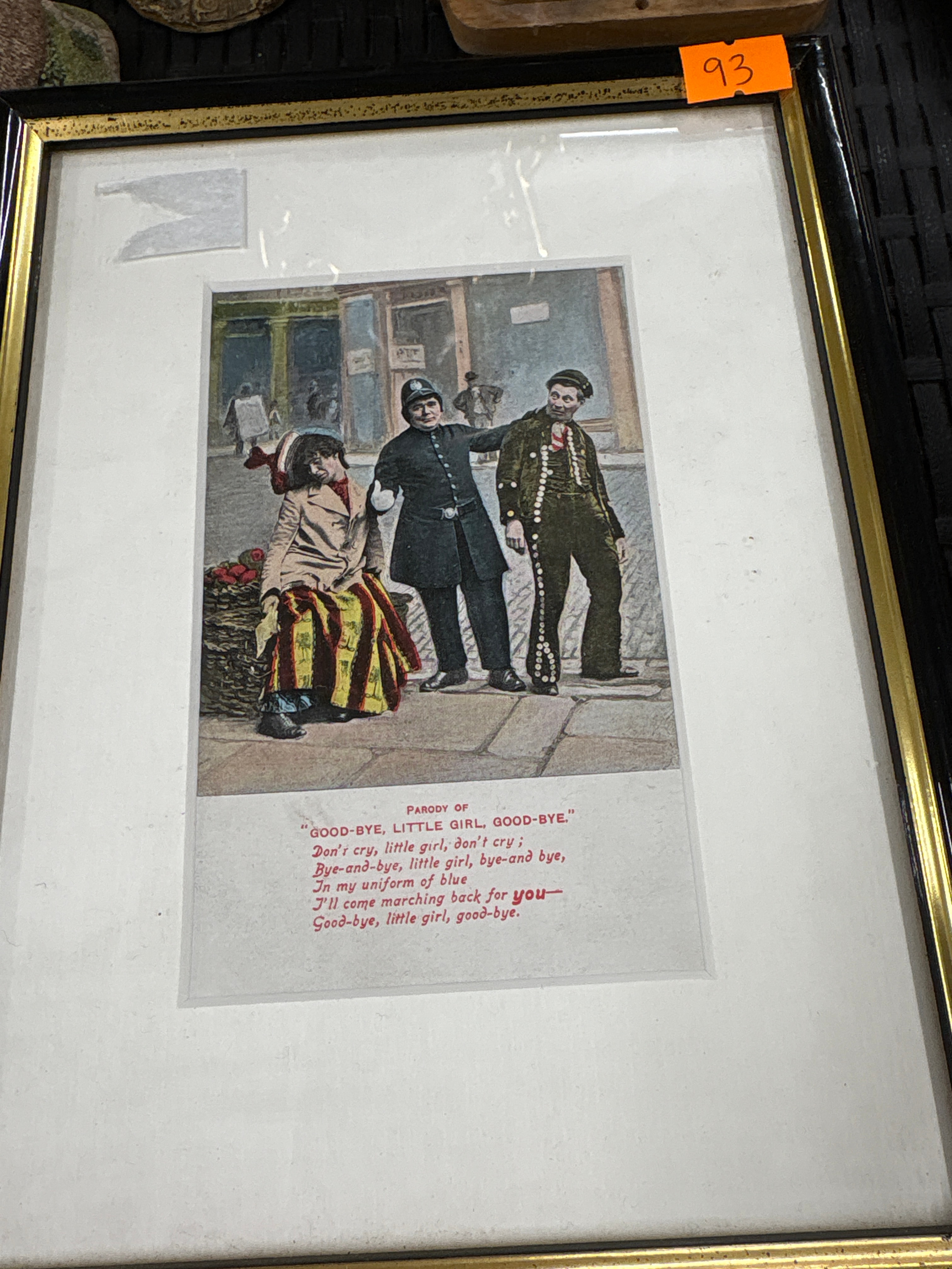 Two prints are colorized: one depicts a street scene with a police officer, a woman, and a man, accompanied by the partial lyrics to “PARODY OF GOOD-BYE, LITTLE GIRL, GOOD-BYE.” (“Don’t cry, little girl, don’t cry; Bye-and-bye, little girl, bye-and-bye, In my uniform of blue I’ll come marching back for you— Good-bye, little girl, good-bye.”); the second shows an interior scene with three figures, captioned “TEASING.” with corresponding lyrics (“Teasing—teasing—I was only teasing you Teasing—teasing—just to see what you would do (Of course you know, my heart is true) Always teasing—to find out if your love was true. Don’t be angry, I was only, only teasing you.”).