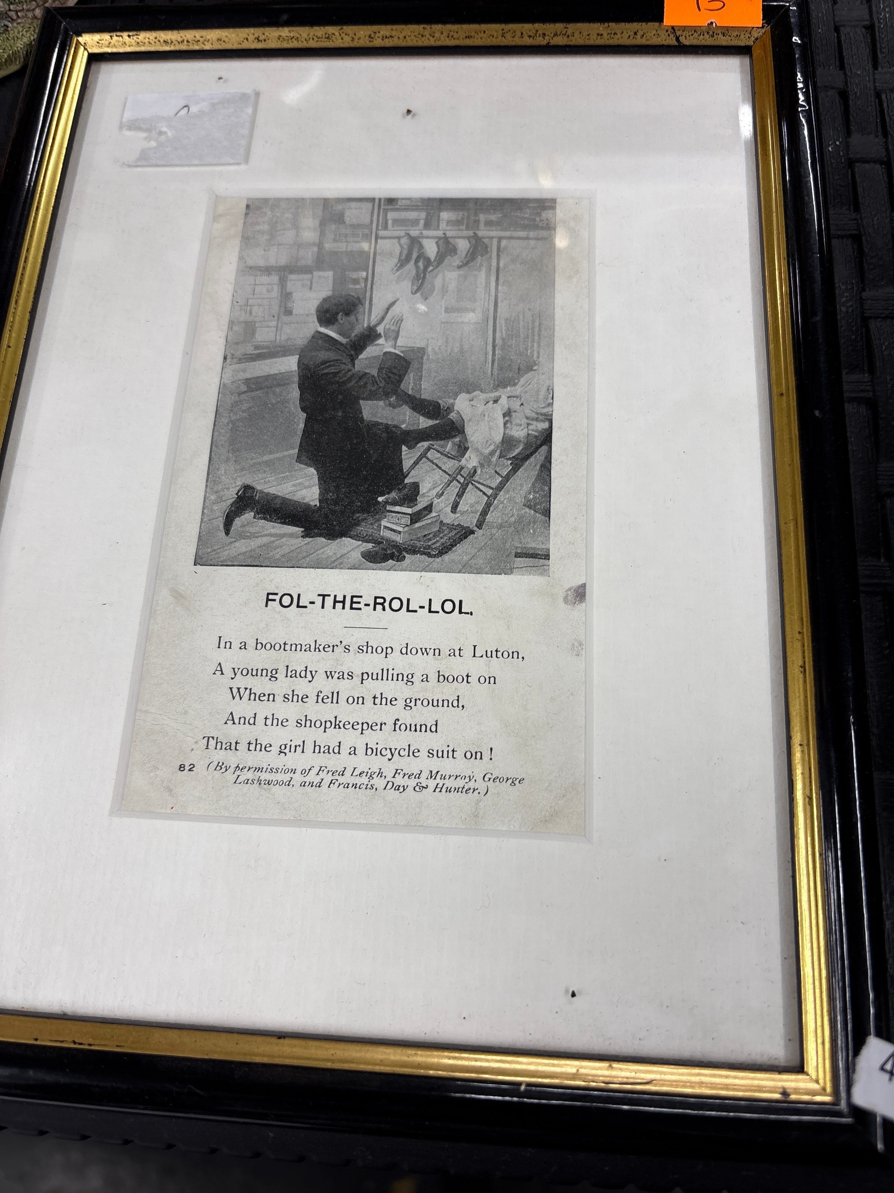The third print is a black and white image of a man fitting a shoe on a woman in a shop, titled “FOL-THE-ROL-LOL.” with a descriptive poem (“In a bootmaker’s shop down at Luton, A young lady was pulling a boot on! When she fell on the ground, And the shopkeeper found That the girl had a bicycle suit on!”) and attributed to Fred Leigh, Fred Murray, George [illegible], and Grafton, Roy & Henley.