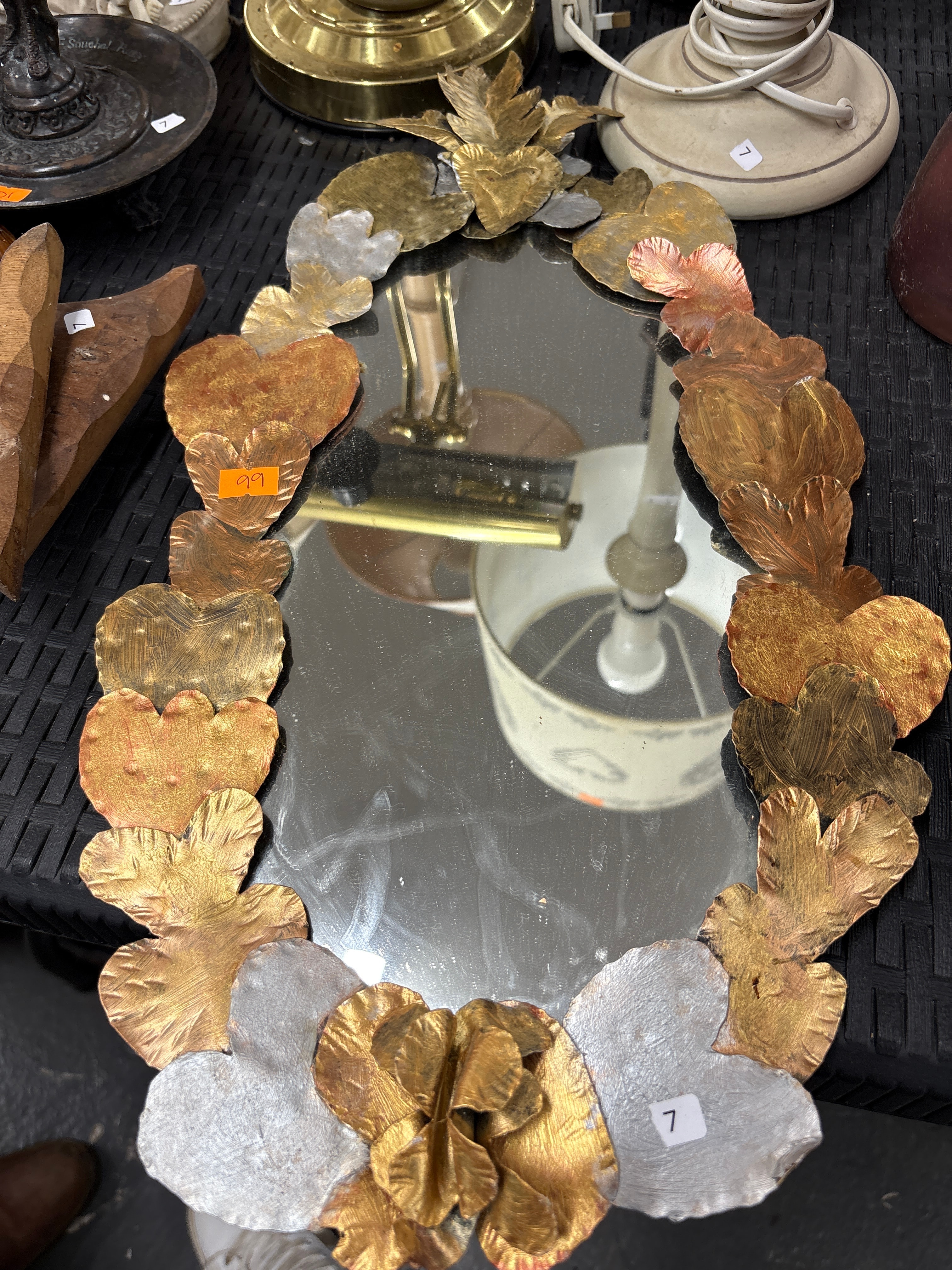 An oval wall mirror framed by a decorative border of overlapping, shaped sheet metal elements, primarily in gold/bronze and silver tones, depicting hearts and stylized foliage. A prominent winged sacred heart motif, appearing to emanate flames, crowns the top. The metal exhibits a textured or hammered finish, suggesting it could be crafted from materials such as brass, copper, or tin.