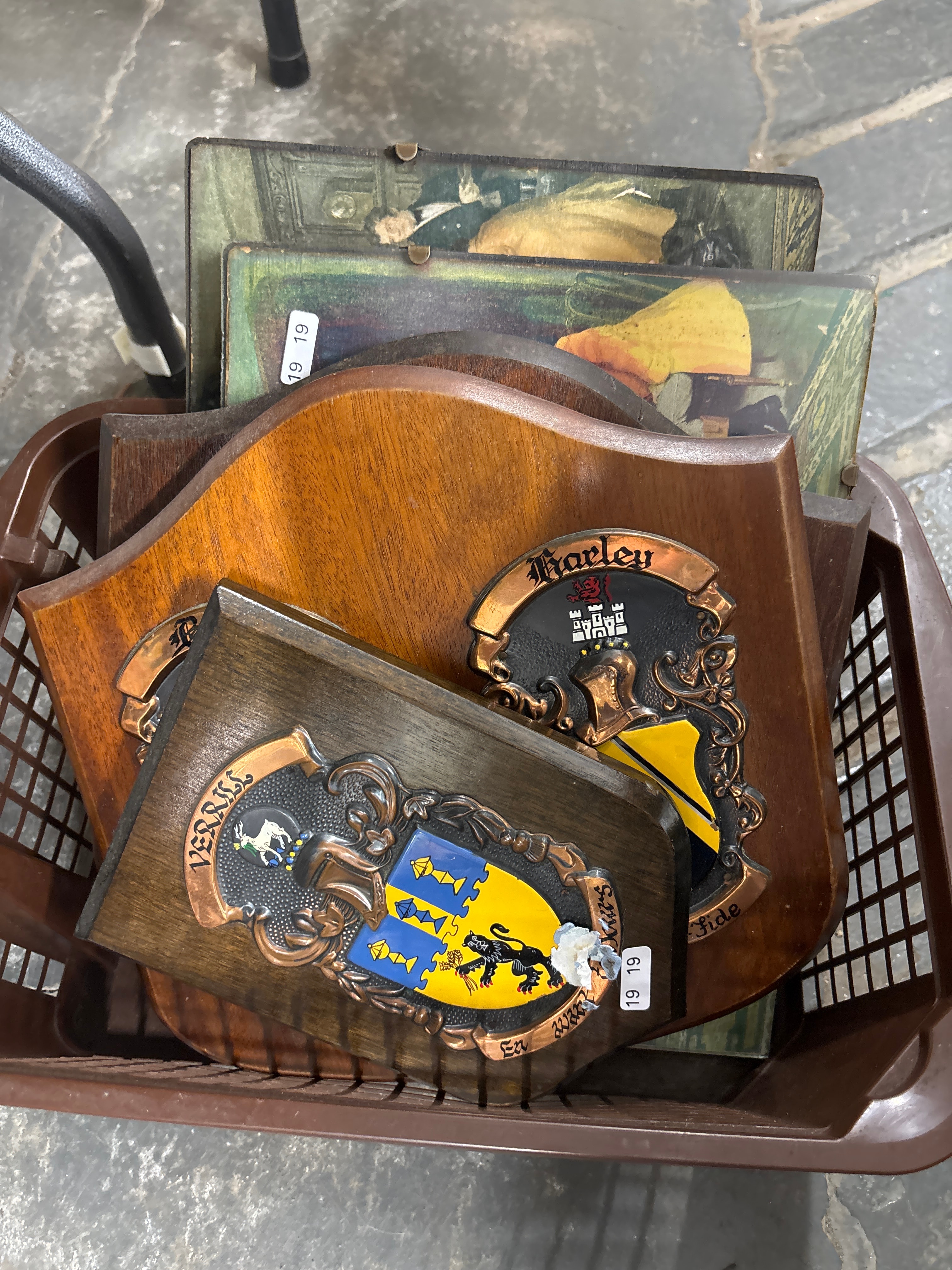 A collection of decorative items, including two family coat of arms wall plaques and a group of mounted prints, presented in a brown plastic basket. The two prominent wooden plaques feature ornate applied metalwork, appearing as bronze or copper-toned, framing heraldic designs with painted or enameled elements in blue, yellow, and black. One plaque has a medium-stained, shaped top edge and bears the English text ‘Harley’ and the Latin phrase ‘Fide’. The second plaque has a darker, rectilinear finish and features the English text ‘VERRIL’ and a partial Latin phrase ‘Es’. Beneath these are at least two mounted prints, appearing to be reproductions of classical-style paintings, featuring muted colors and figures with drapery, possibly dating from the 20th century. The overall style suggests a traditional or revivalist aesthetic.