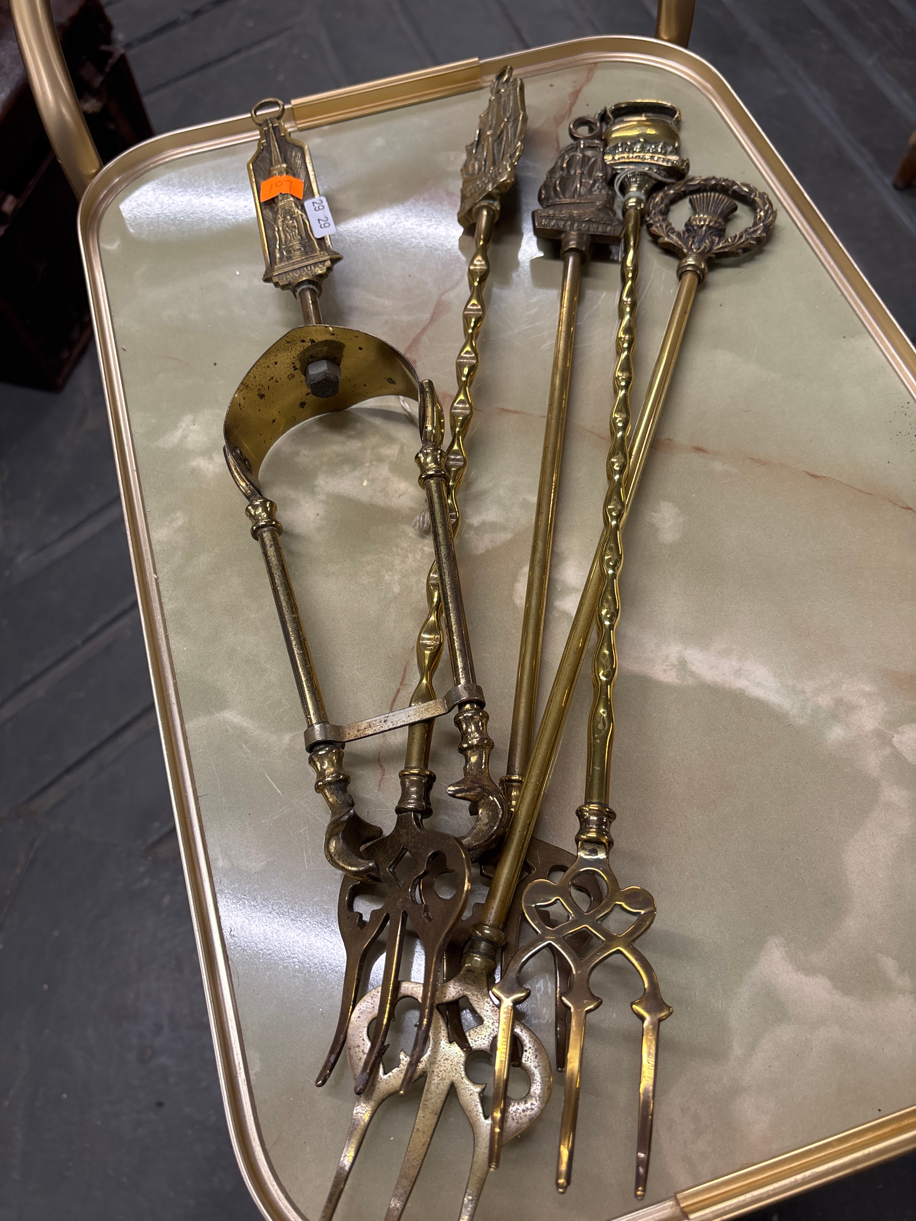 A collection of eleven individual antique or vintage brass implements, primarily identified as English fireplace and toasting tools from the late 19th to early 20th century. Each piece is crafted from solid brass or bronze and features a distinct ornate finial atop a twisted or plain shaft. Notable finials include a ship inscribed “MAYFLOWER,” an architectural representation resembling the Eiffel Tower (with faint text potentially reading “PARIS” or “FRANCE” below), a Scottish thistle motif, a robed figure, and various stylized torches or decorative elements. The implements terminate in either bifurcated tines, trifurcated tines, or a single pointed end; one implement also presents as a hinged tong-like device. Visible retail tags on two items indicate numbers “10 10 / 025” and “29 29”.