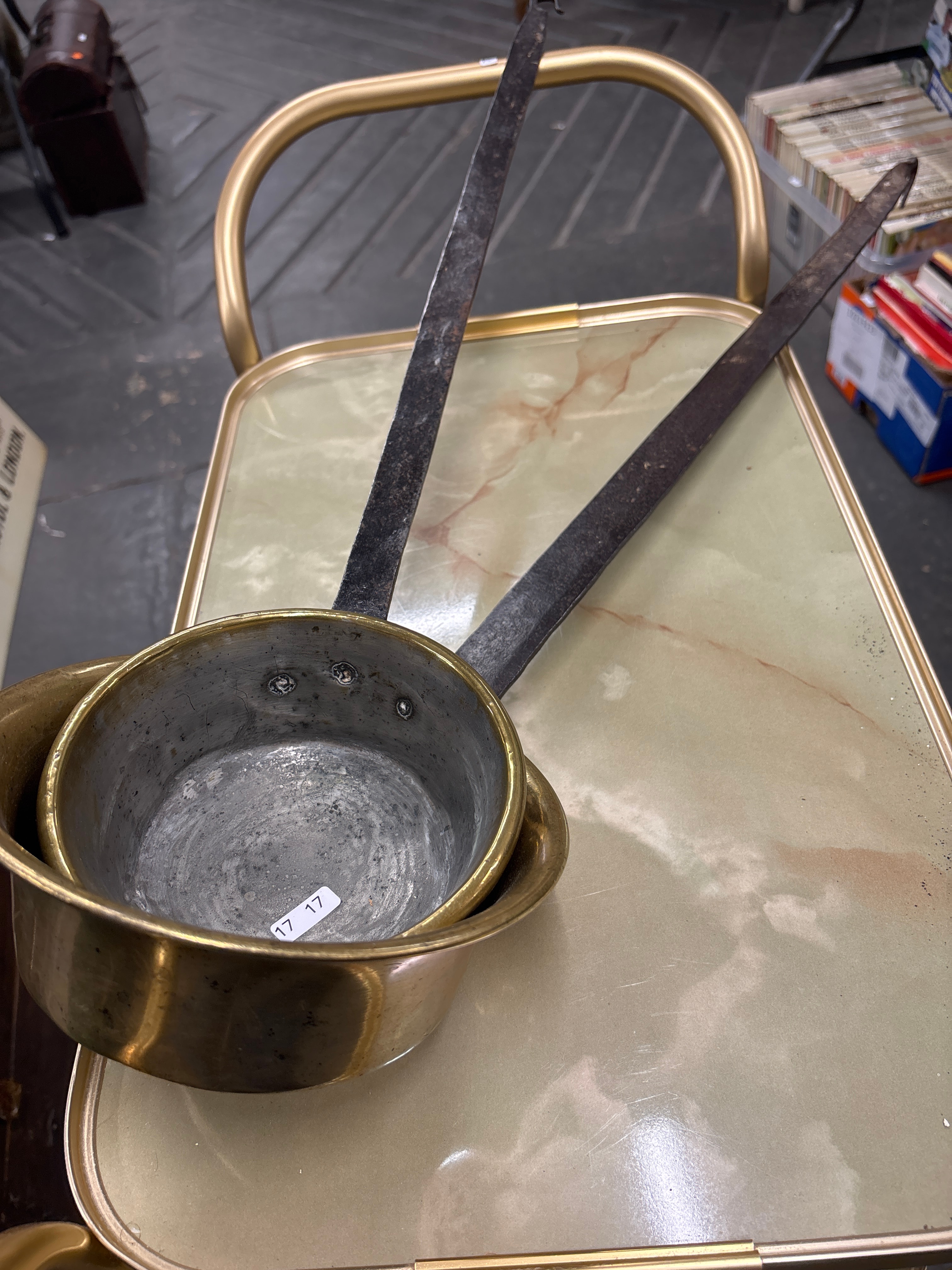 A pair of antique heavy brass cooking vessels, likely saucepans, featuring a nested design. The larger, outer vessel is crafted from brass, exhibiting an aged and tarnished patina. The smaller, inner vessel, or lining, is constructed from a greyish metal, possibly tin. Both vessels are fitted with long, flat, utilitarian handles made of dark, heavily oxidized iron or steel, attached with prominent rivets. A white rectangular sticker with the numbers “17 17” is visible inside the smaller vessel.