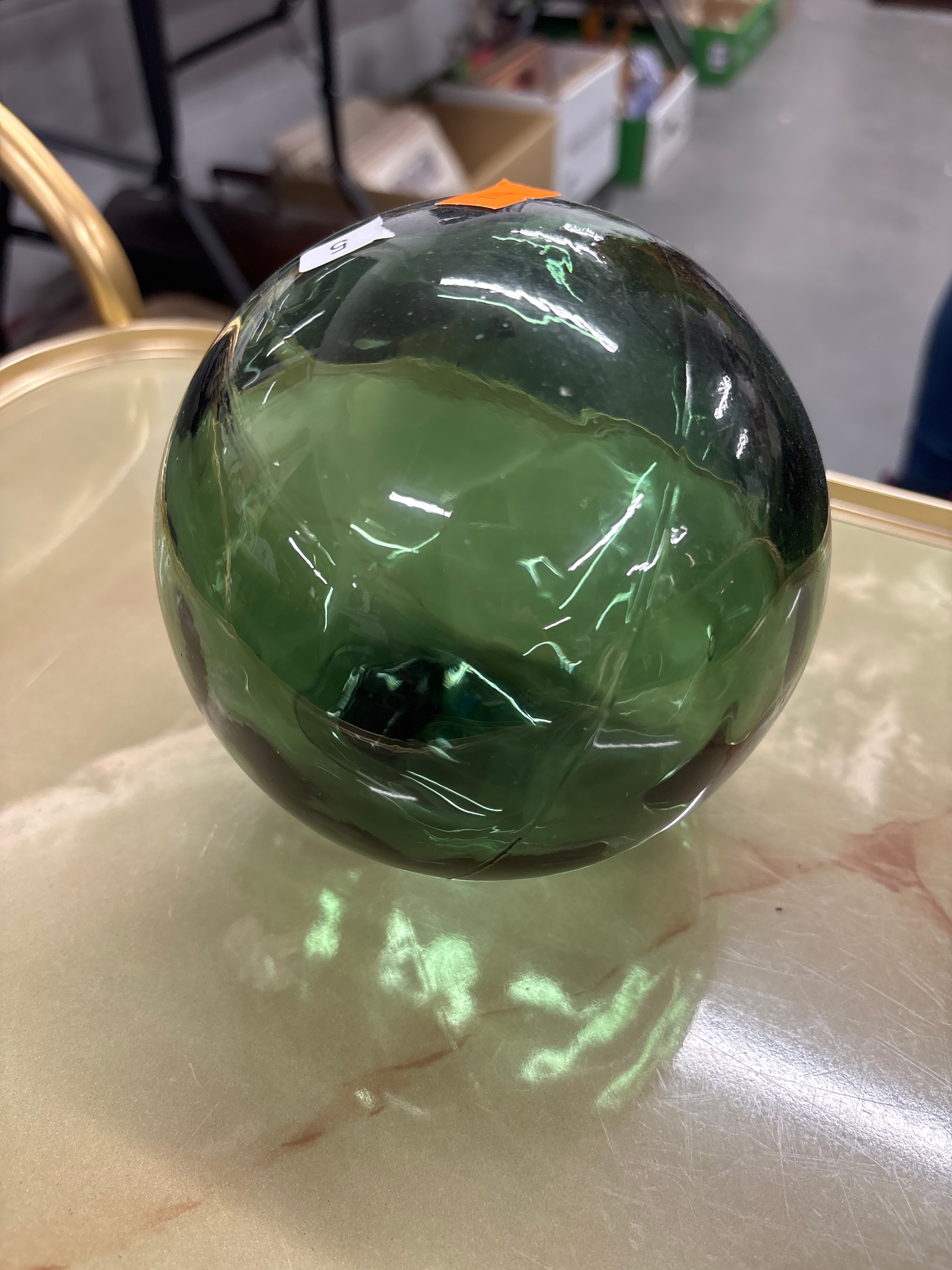 A vintage hand-blown green glass fishing float. This spherical object is crafted from dark green translucent glass. Its surface exhibits a somewhat irregular, organic texture, consistent with a hand-blown or molded manufacturing process. A white label with the visible number ‘5’ is affixed to its upper left side, alongside a small orange sticker.