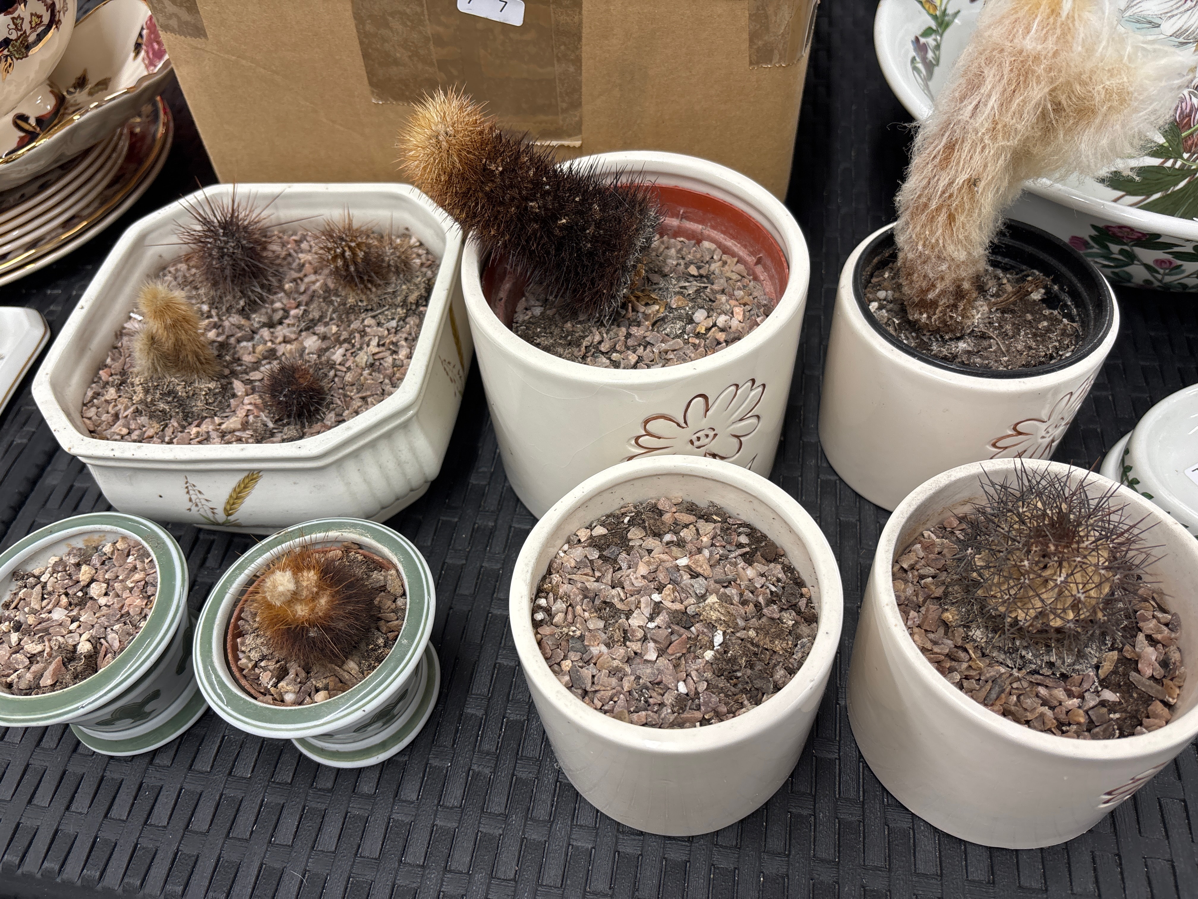 A collection of seven live potted cacti presented in assorted ceramic containers, resting on a black woven mat. The planters include a white rectangular dish adorned with a subtle wheat motif, several plain white cylindrical pots (one featuring a simple etched daisy design), and two smaller white pots with distinctive green banded rims and a stylized green pattern. The cacti themselves display varied characteristics, ranging from compact forms with dark or golden-brown spines to an elongated, heavily fuzzy light-colored specimen. All plants are presented in soil topped with decorative gravel or bark chippings.