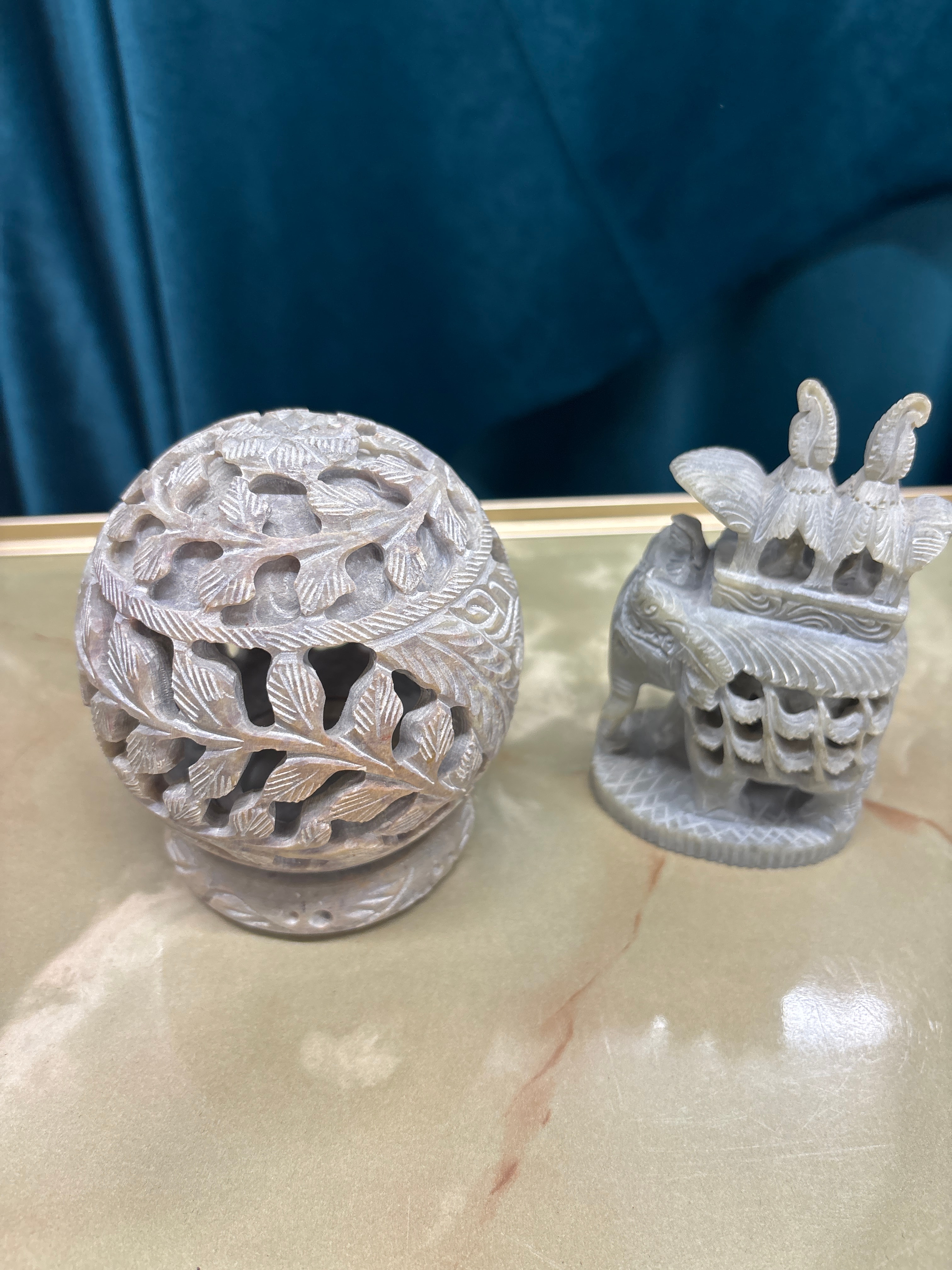 A pair of hand-carved soapstone tea light candle holders. Crafted from a light greyish-beige soapstone, the lot comprises two intricately carved decorative objects. The first is a spherical openwork orb, featuring a continuous foliate pattern of leaves and vines, resting on a circular base with an incised border. The second is a sculpted figure resembling a caparisoned elephant, detailed with a howdah-like structure on its back surmounted by two stylized finials, and exhibiting openwork elements throughout its form, with a cross-hatch pattern on its base. Both pieces exhibit a consistent carving style.