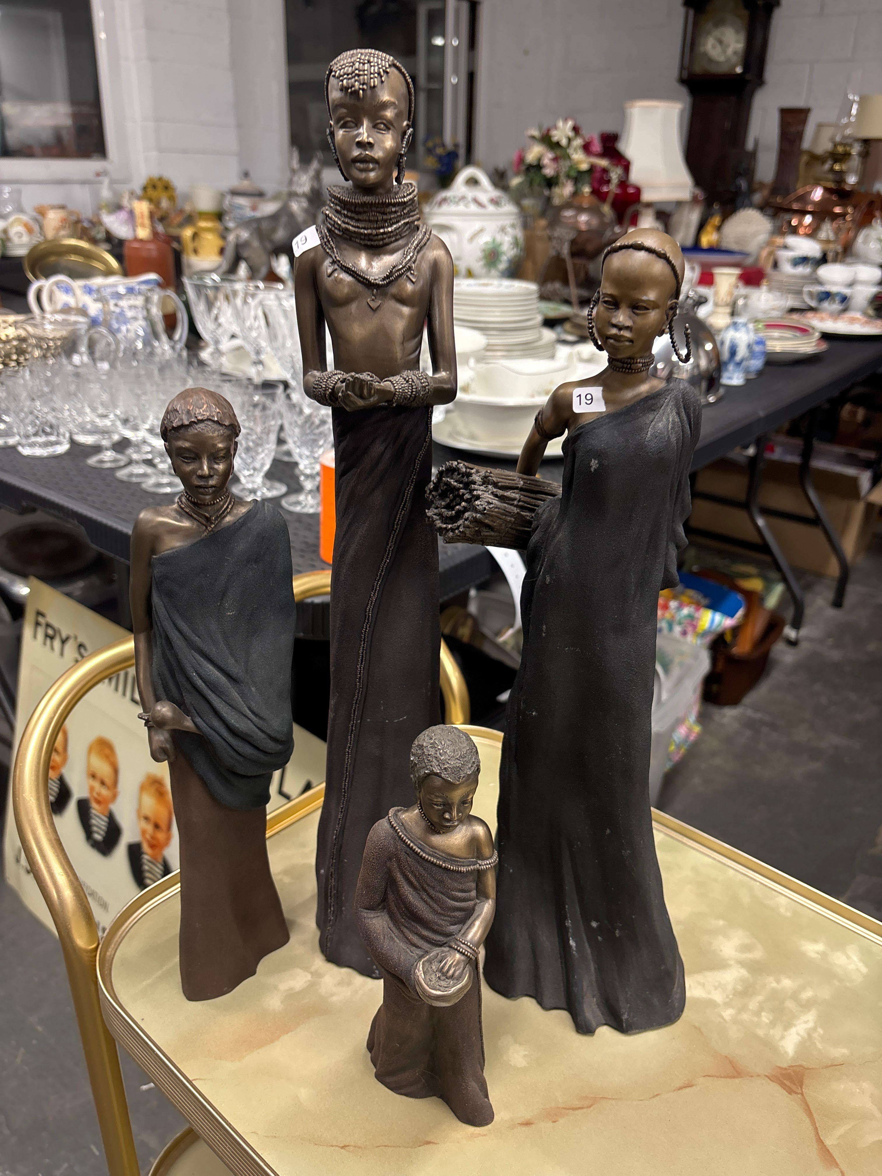 A group of four bronze-finished sculptures, likely cast in bronze or a bronze-patinated resin, depicting figures of indeterminate African origin. The figures vary in height and pose, presented in an ethnographic style with traditional-looking attire and hairstyles. The tallest figure features intricate beaded adornments around the neck, forearms, and head. Another prominent figure carries a bundle of logs on her shoulder and wears large hoop earrings. The two smaller figures are draped in garments and wear simple necklaces, with the smallest kneeling figure holding a shallow bowl. Visible white tags displaying numbers “13” and “19” are present on two of the taller figures, likely indicating lot or price numbers.