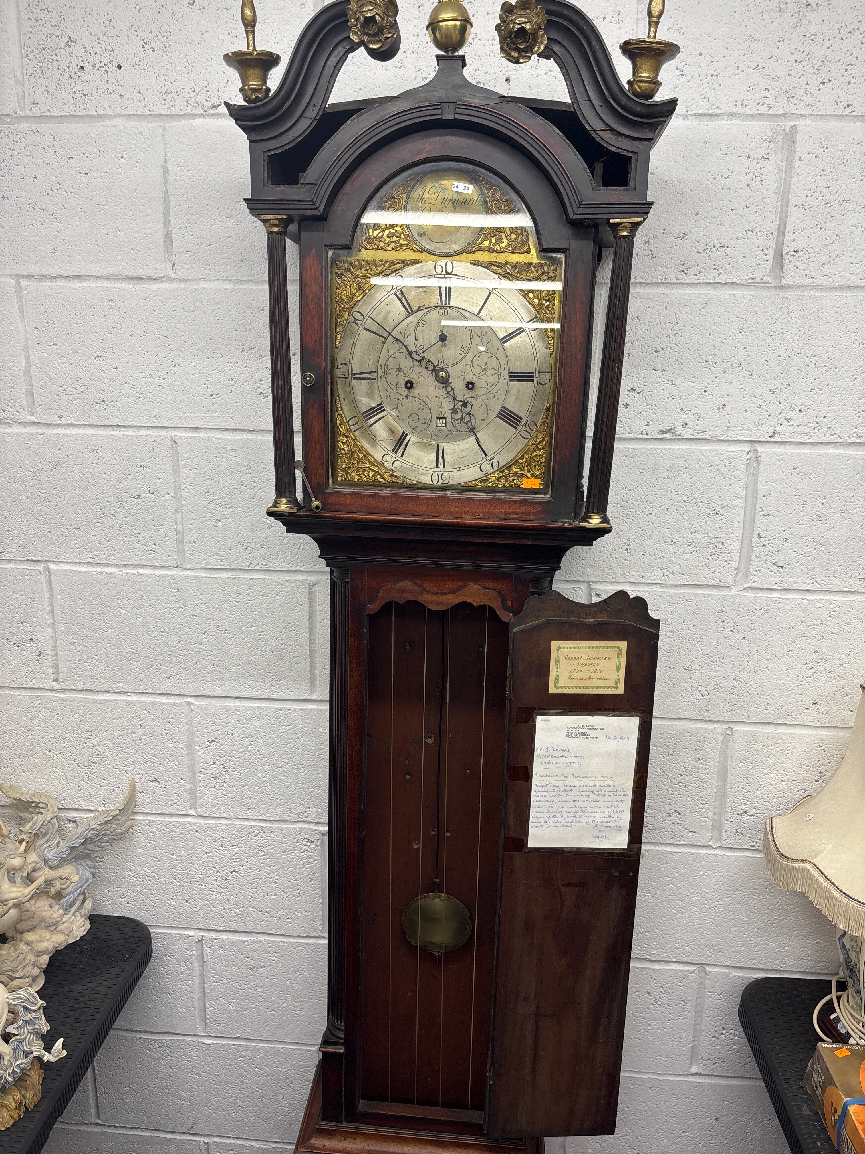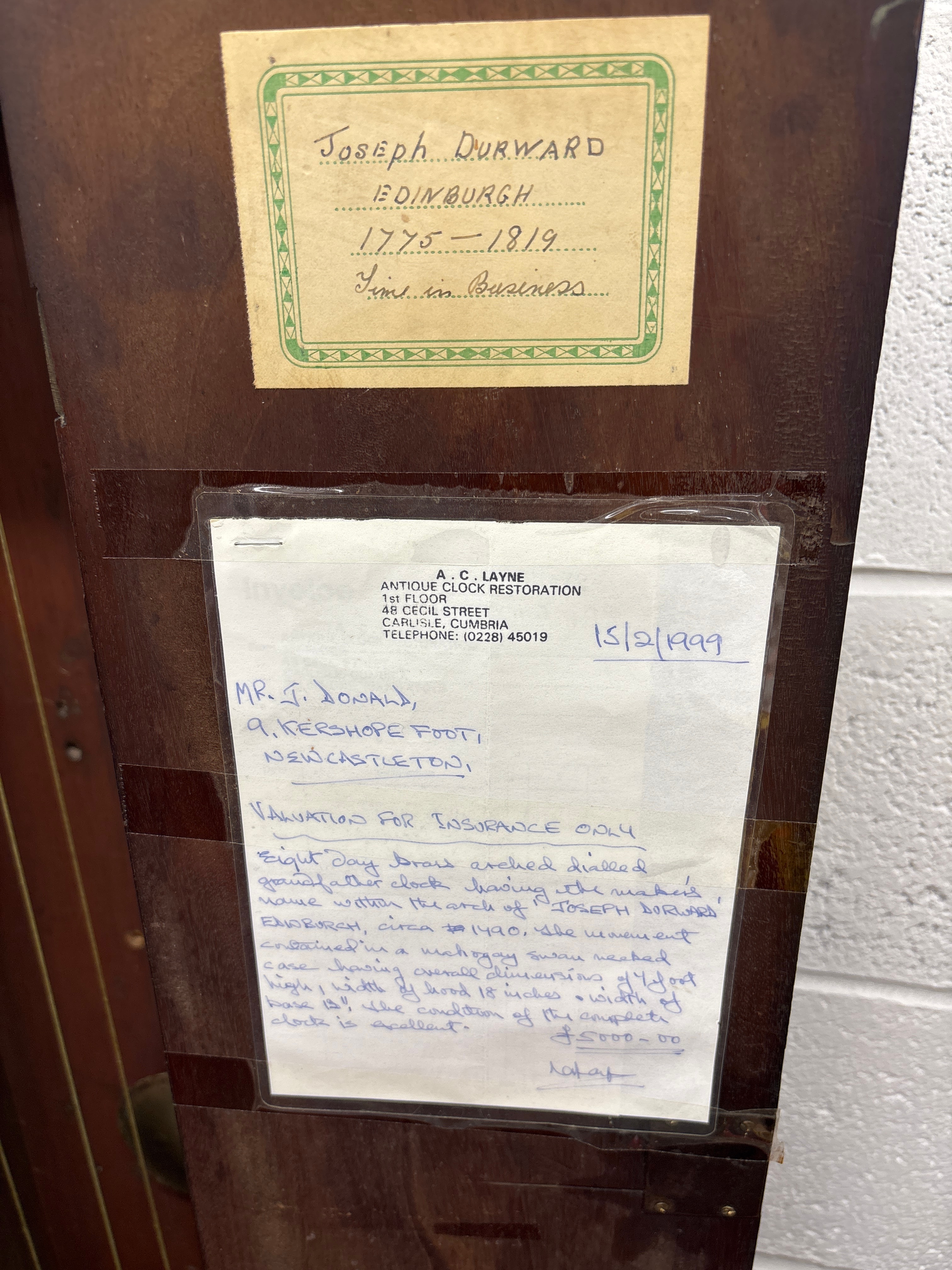 An eight-day longcase clock by Joseph Durward of Edinburgh, active 1775-1819. The clock features a mahogany case in a Georgian style, with an arched hood adorned with decorative brass finials. The brass dial displays Roman numerals for hours, Arabic numerals for minutes, and includes subsidiary dials. The arch of the dial is signed “DURWARD.” The trunk door opens to reveal the pendulum and weights.