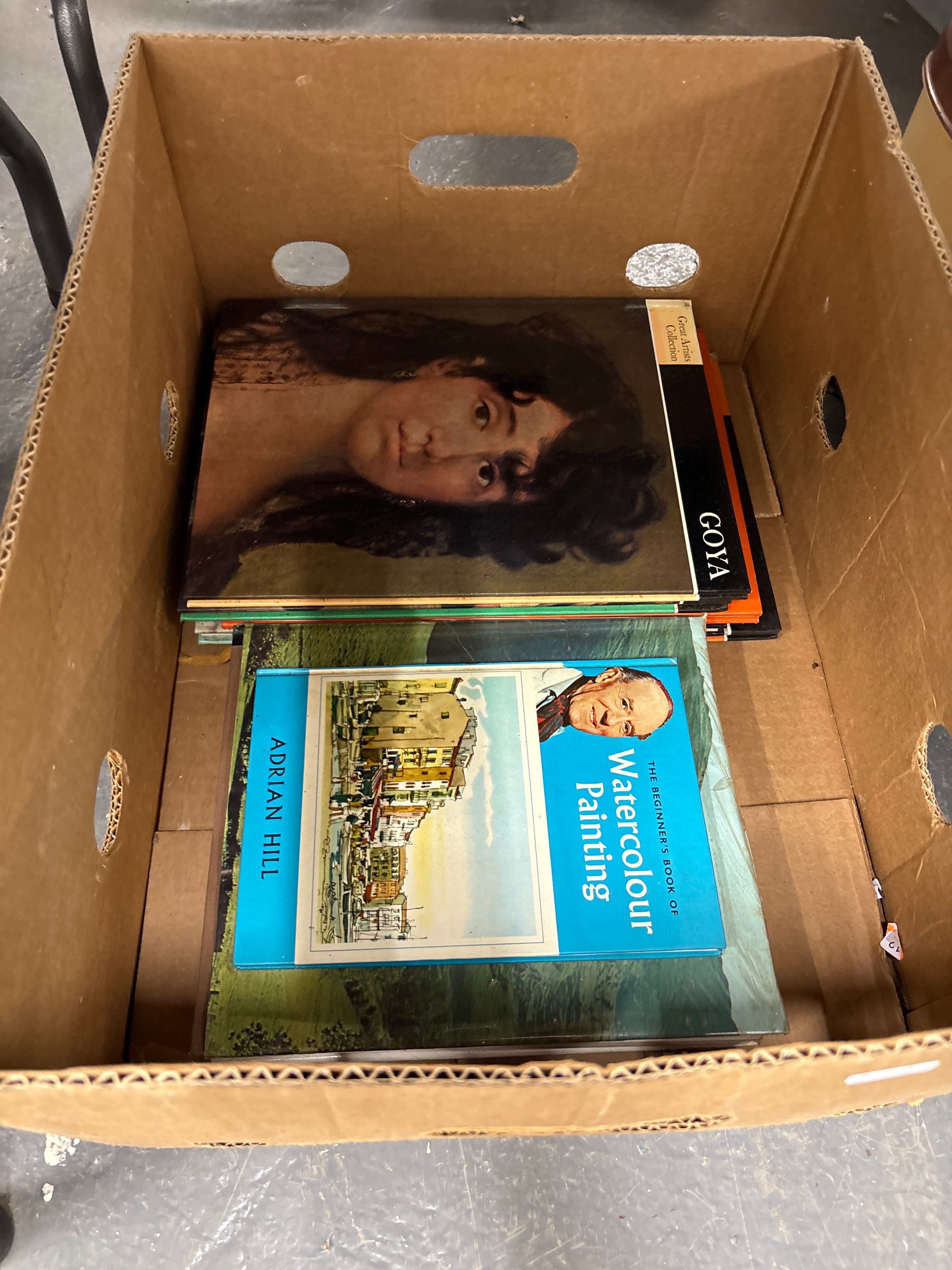 This collection of hardcover art books prominently features ‘The Beginner’s Book of Watercolour Painting’ by Adrian Hill. This instructional art book displays a portrait of the author and a watercolor cityscape illustration on its cover. Also included is an art volume from a ‘Great Artists Collection,’ with ‘GOYA’ on its spine and a portrait on its cover, indicating a focus on Francisco Goya. The books are housed within a brown corrugated cardboard box with integrated handles.
