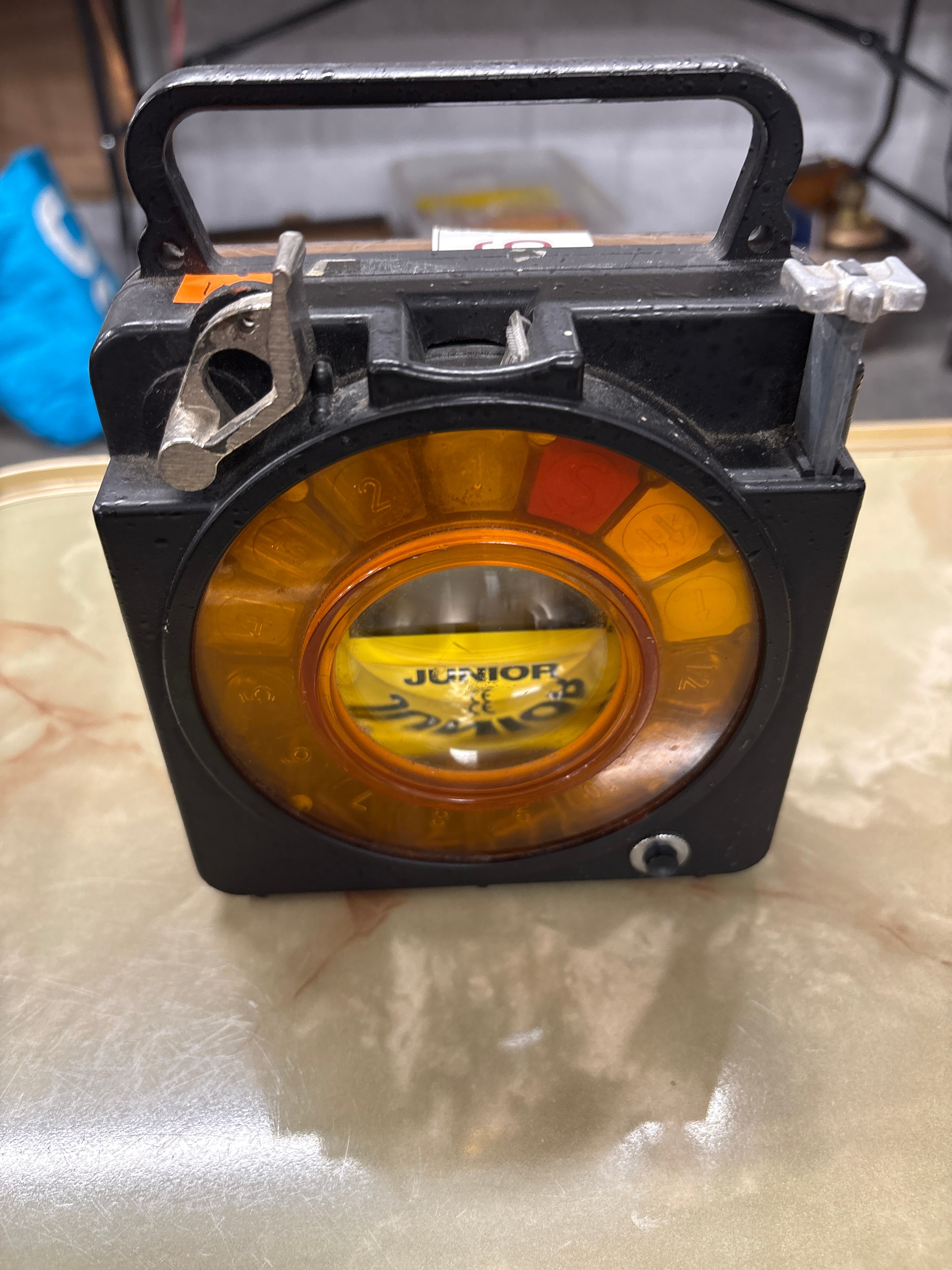 A vintage Junior T3 Racing Pigeon Clock, characterized by a robust, utilitarian design consistent with mid-20th century manufacturing. The object features a dark, possibly painted metal or heavy plastic body, equipped with a textured, hinged metal carrying handle and silver-toned metal latch mechanisms on the top. The front showcases a prominent circular viewing area, comprising an amber-orange translucent outer ring with embossed or printed numbers (including 1, 2, 6, 7, 8, 9, 11, 12) surrounding a clear central lens. Visible through this lens is a yellow internal label bearing the text “JUNIOR,” along with an internal spool-like component. An orange sticker with the number “1” is adhered to the top left, and a partially visible white label with red text is also present.