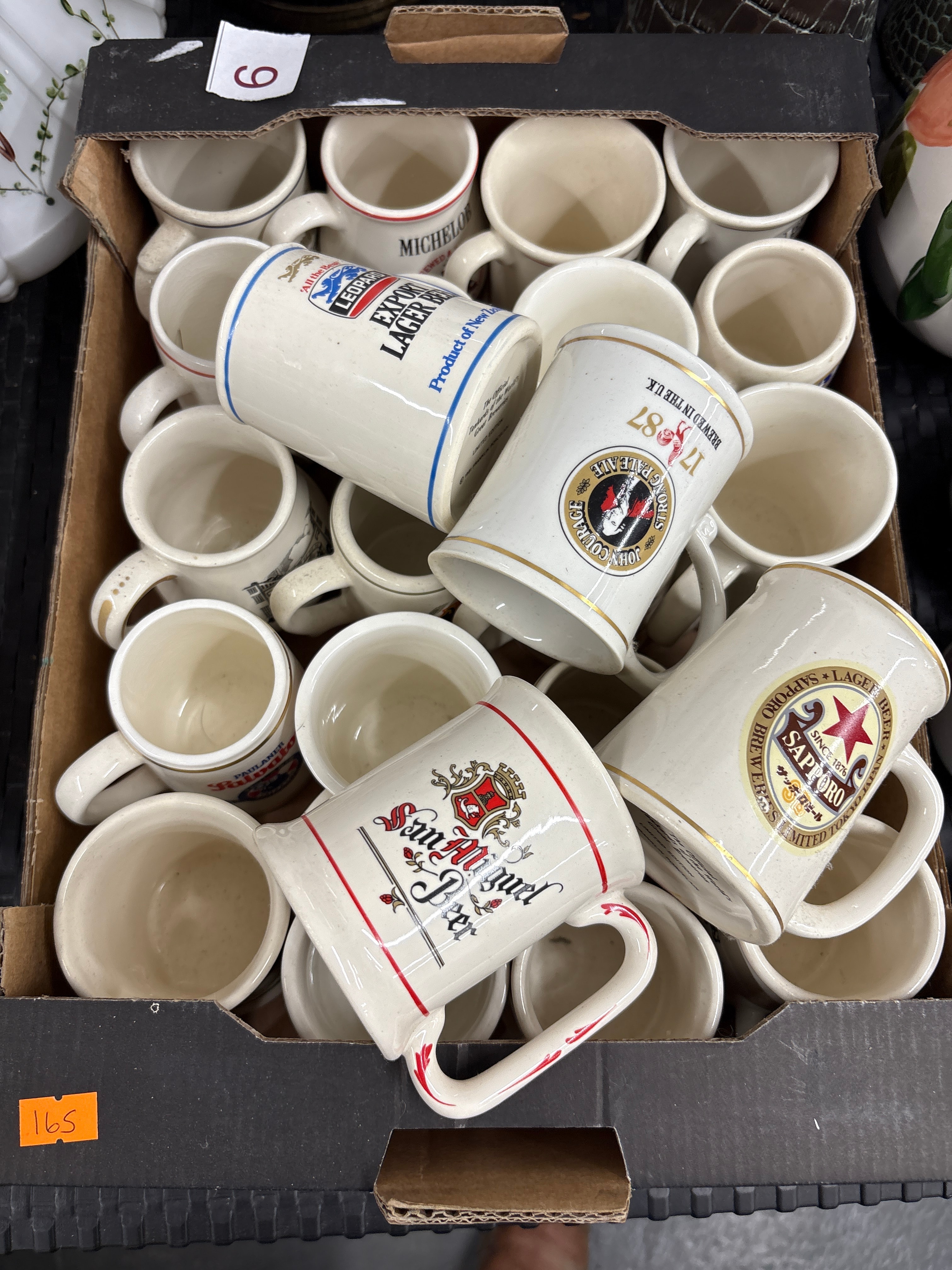 A collection of ceramic promotional mugs from the Franklin Mint series ‘Official Tankards of the World’s Great Breweries’. These approximately two dozen small steins are predominantly in an off-white or cream glaze, featuring various international beer brand logos and text in multiple colors, including blue, red, gold, and black. Brands represented include “EXPORT LAGER BEER” with a leopard (likely Whitbread), “JOHN COURAGE STRONG BREWED IN THE U.K. 1787”, “SAPPORO LAGER BEER SINCE 1876 BREWERIES LIMITED TOKYO” (with the Japanese text “サッポロビール”), “San Miguel Beer” with a heraldic crest, “MICHELOB”, and “PAULANER Salvator”.