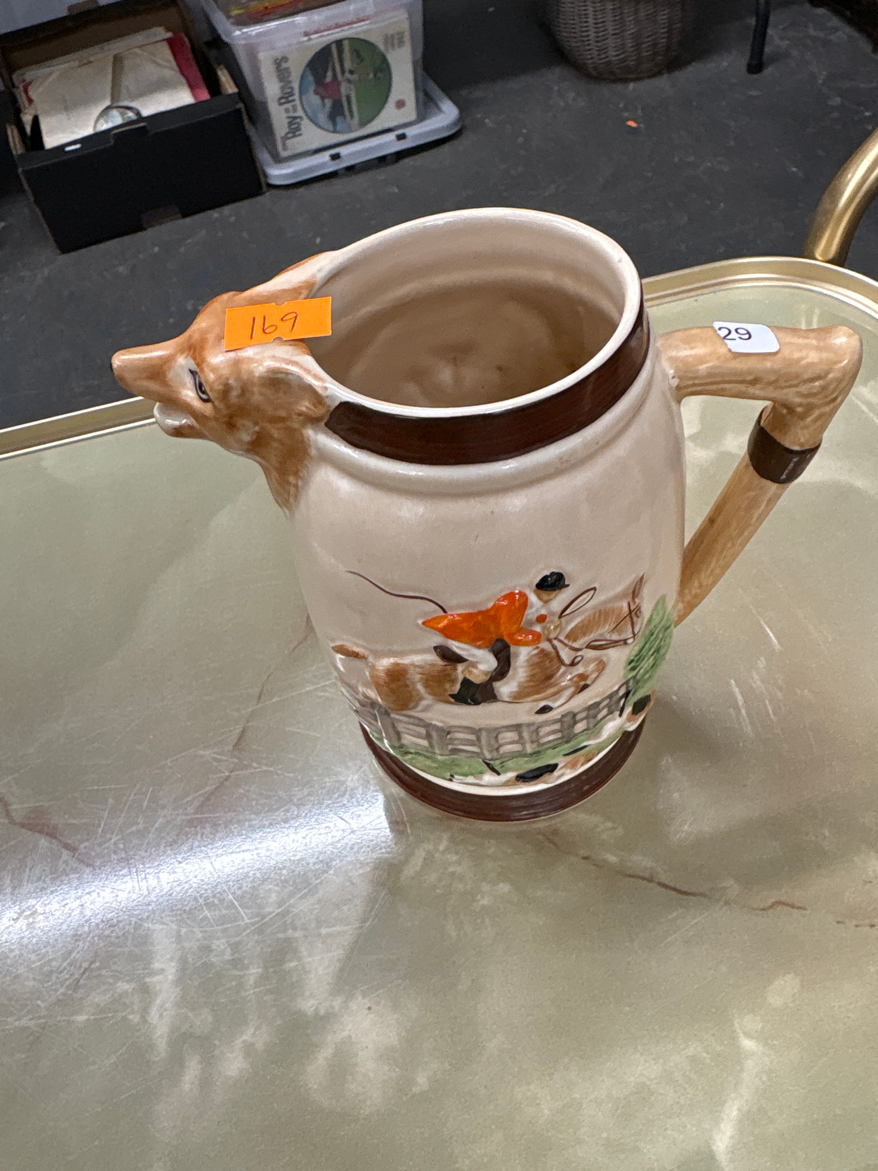 A Keele Street Pottery ‘Fox Hunting Scene’ pitcher, crafted from ceramic. This pitcher features a distinctive fox head spout and a handle molded to resemble a riding crop, complete with a dark brown band. The body is decorated in relief with a hand-painted fox hunting scene, depicting a rider on horseback, several hounds, and a fence, all set against a light cream-colored glaze with a dark brown band accenting the rim and base. An orange sticker bearing the number “169” is affixed to the fox’s head, and a white sticker with the number “29” is on the handle.