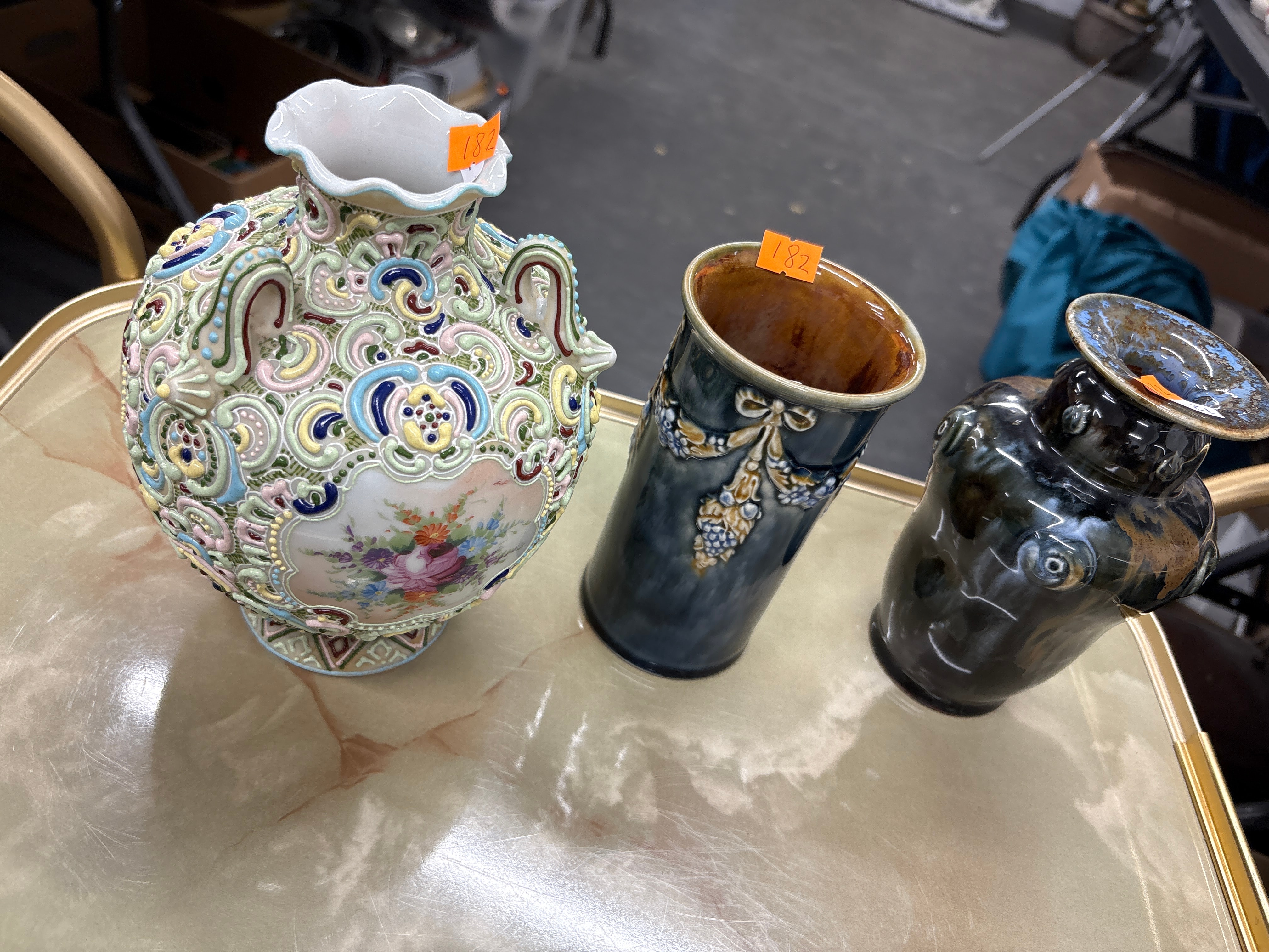 A collection of three Royal Doulton ceramic vases, comprising diverse forms and decorations. The leftmost is an ornate, urn-shaped porcelain vase featuring polychrome relief enamel decoration in pastel hues, including prominent floral cartouches depicting a bouquet, and having a scalloped rim with two handles. The central item is a tall, cylindrical stoneware vase, identified as a “Cobalt Blue Hop Swag Vase,” in a dark blue/grey glaze, embellished with relief swags and bows suggestive of grapes or berries, and possessing a contrasting reddish-brown interior. The third item, on the right, is a dark-glazed figural vase with an organic form, exhibiting a mottled blue, brown, and black iridescent finish, and an irregularly flared opening. All three items bear orange price tags marked “182” near their openings.