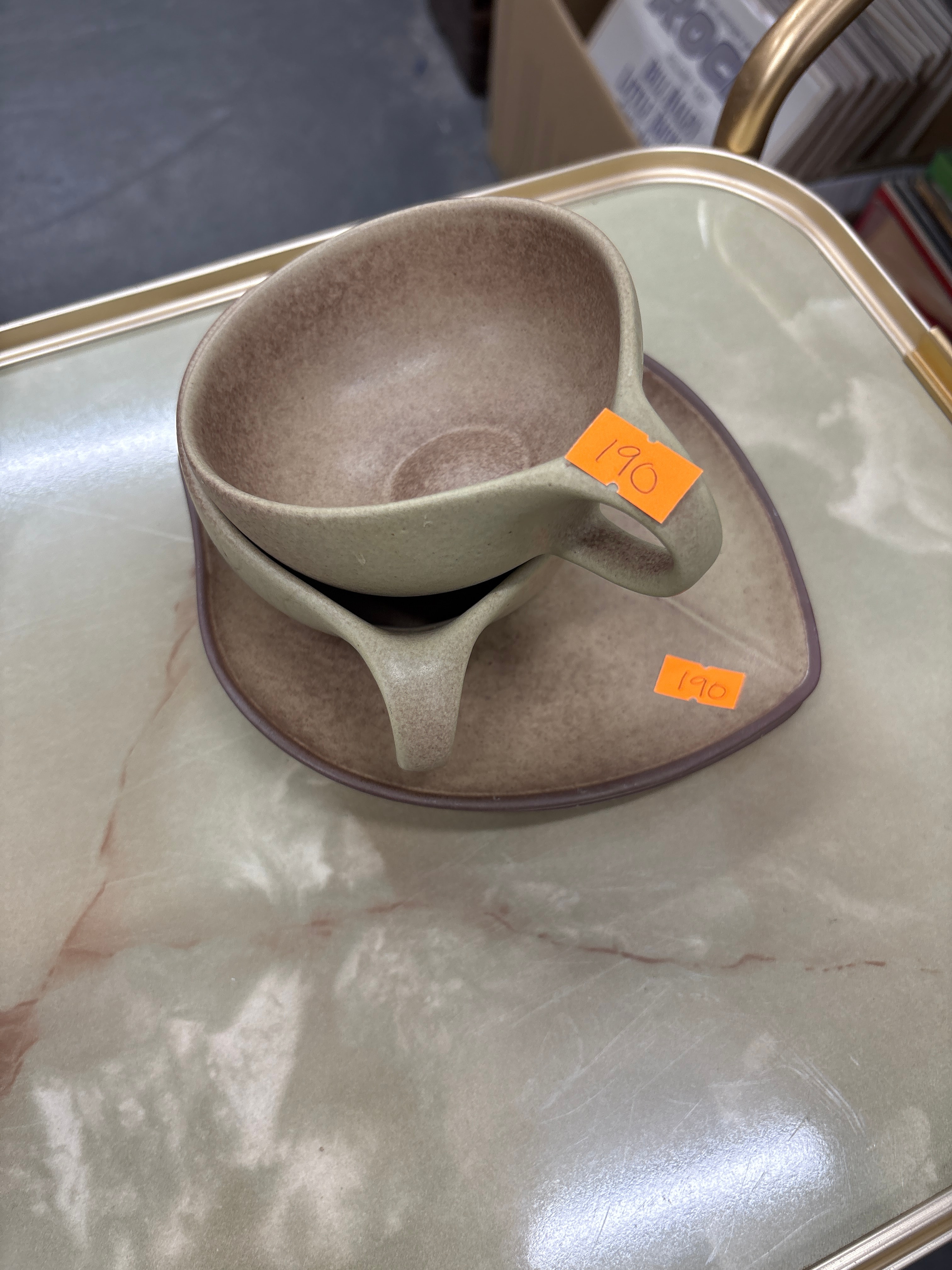 A Mid-Century Modern organic stoneware cup and saucer set. Crafted from speckled stoneware or pottery, the pieces feature a matte, earthy brown-beige glaze. The cup has a wide, shallow, irregularly shaped bowl with a distinctive integrated handle, paired with a matching, similarly shaped saucer.