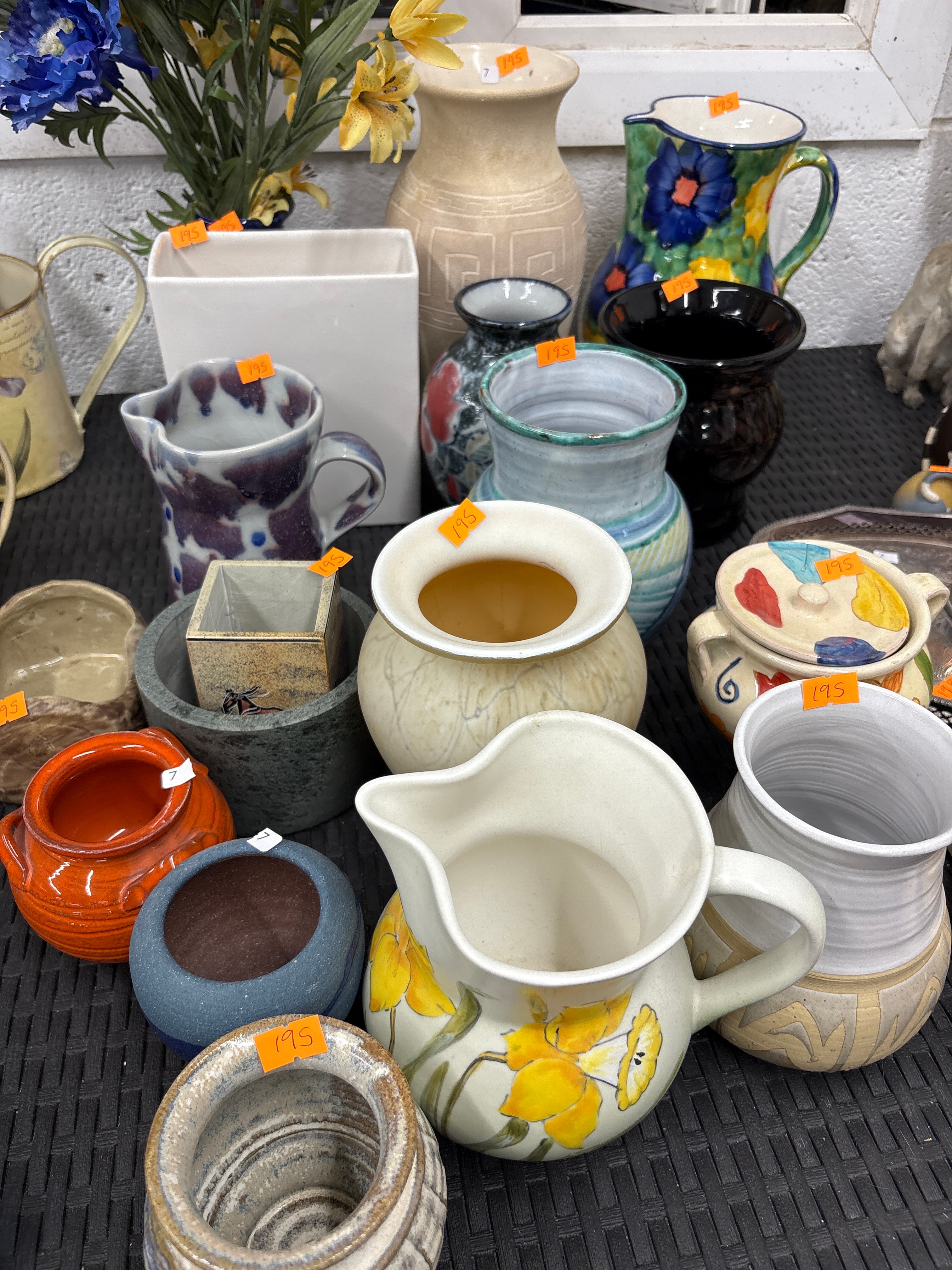 A diverse collection of approximately twenty ceramic vessels, encompassing various forms such as vases, pitchers, pots, and lidded containers. The items exhibit a range of styles, from rustic to more contemporary decorative ceramics. Specific examples include a beige vase featuring a geometric Greek key-like pattern, a cream pitcher with hand-painted yellow daffodil motifs, and a blue and green pitcher adorned with vibrant painted blue flowers. Materials are predominantly glazed pottery, likely earthenware or stoneware, with finishes varying from glossy to matte and textured, including speckled and marbled effects. Numerous orange price stickers displaying “195” are affixed to many pieces, alongside a few white stickers marked “7”, suggesting inventory or price points.