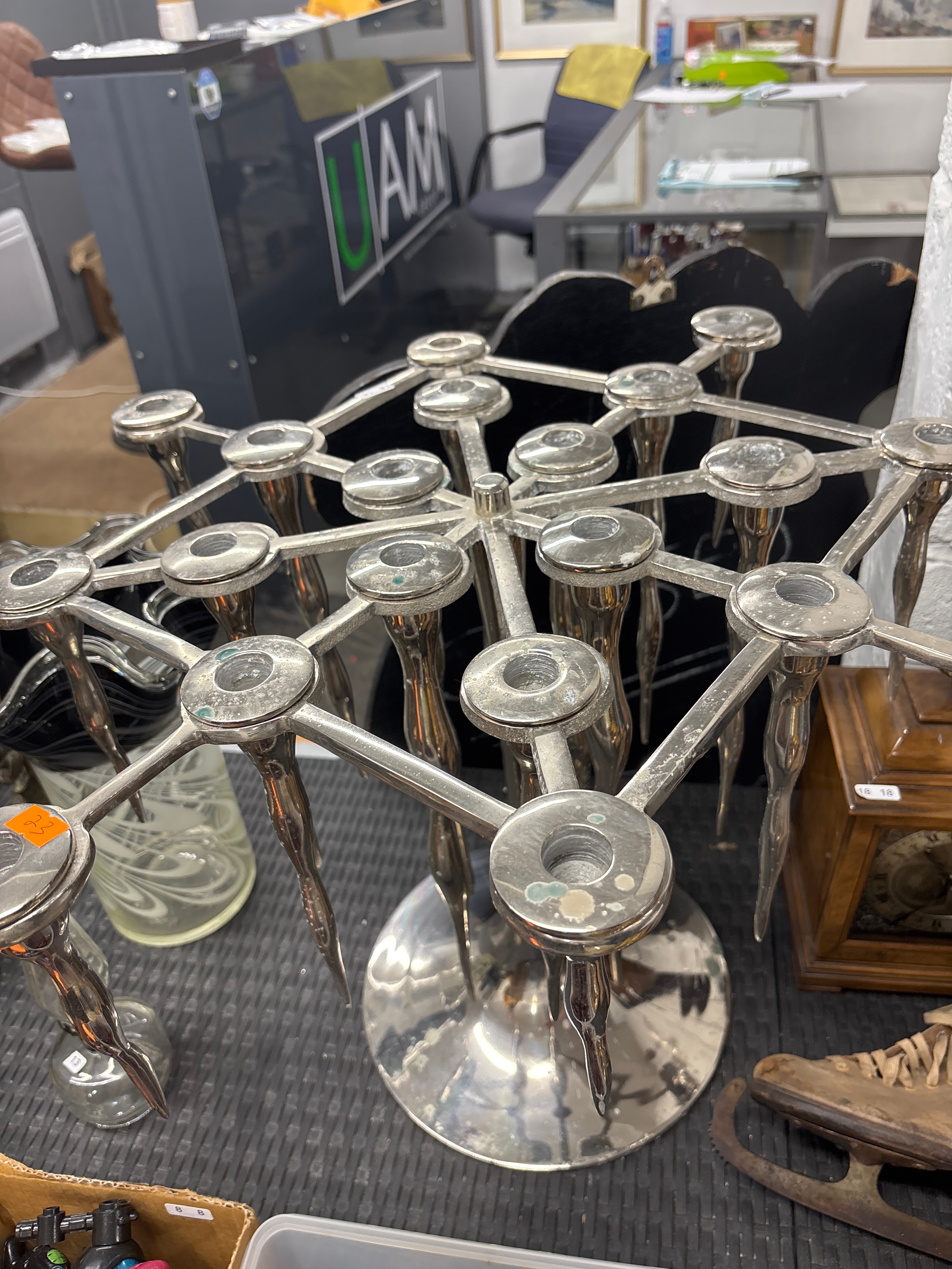 A large, multi-branched candelabrum, identified as a configuration of the ‘Orion’ modular candle holders designed by Ceasar Stoffi & Fritz Nagel for BMF. Constructed from silver-toned metal, the piece displays a geometric and angular Modernist aesthetic. It features a central stem with six primary arms radiating outwards, each terminating in a candle cup. Connecting these arms are additional bars, each supporting another candle cup at its midpoint, plus a central cup where the main arms converge, totaling thirteen candle cups in a symmetrical, snowflake-like arrangement. A small orange sticker marked “23” is present on one cup. No manufacturer’s marks are visible.