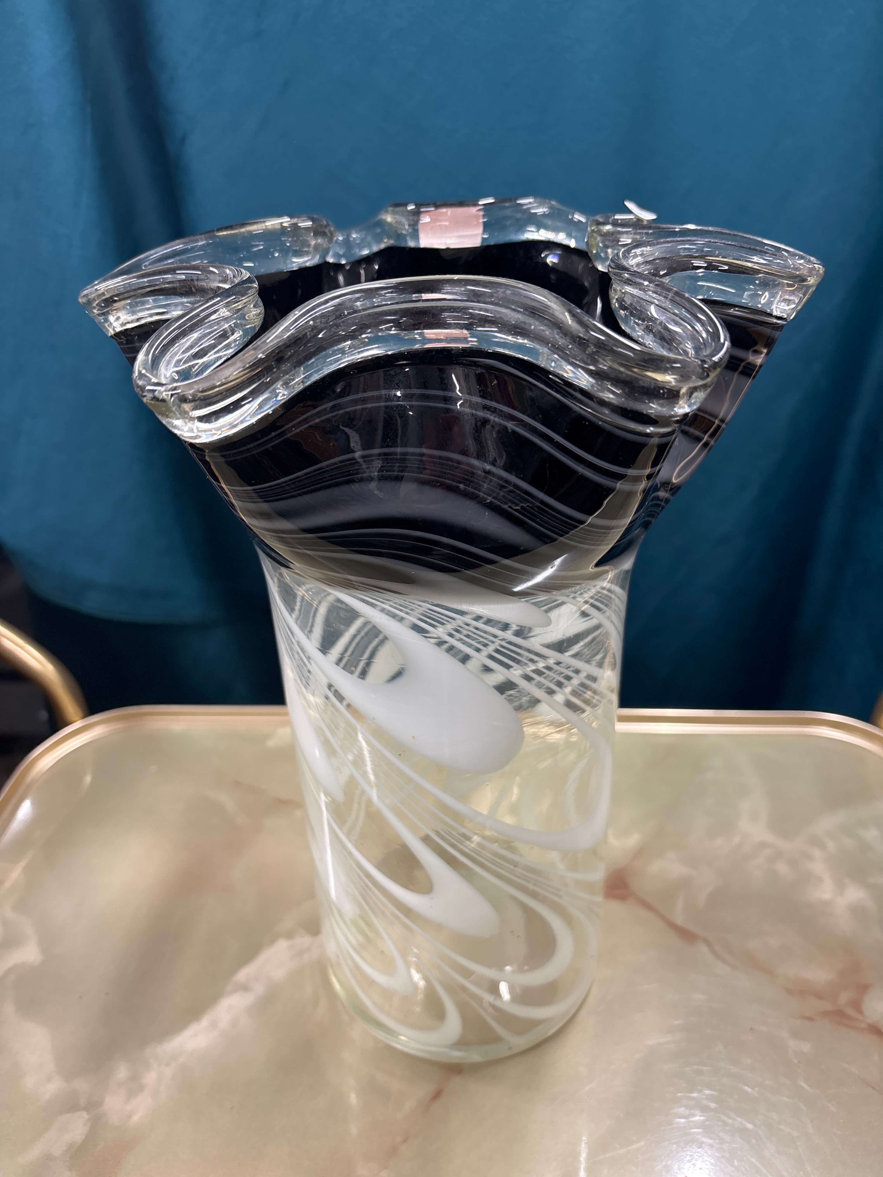 A Murano glass vase by Archimede Seguso, circa 1950s. The piece is constructed from clear, black, and opaque white glass. It features an irregularly ruffled or undulating clear glass rim, which transitions into an opaque black mid-section with a horizontally wavy texture. The lower, cylindrical body is crafted from clear glass, internally decorated with dynamic, swirling opaque white lines, reminiscent of a latticino pattern. A small, illegible, reddish-pink rectangular label is present on the interior of the ruffled rim.