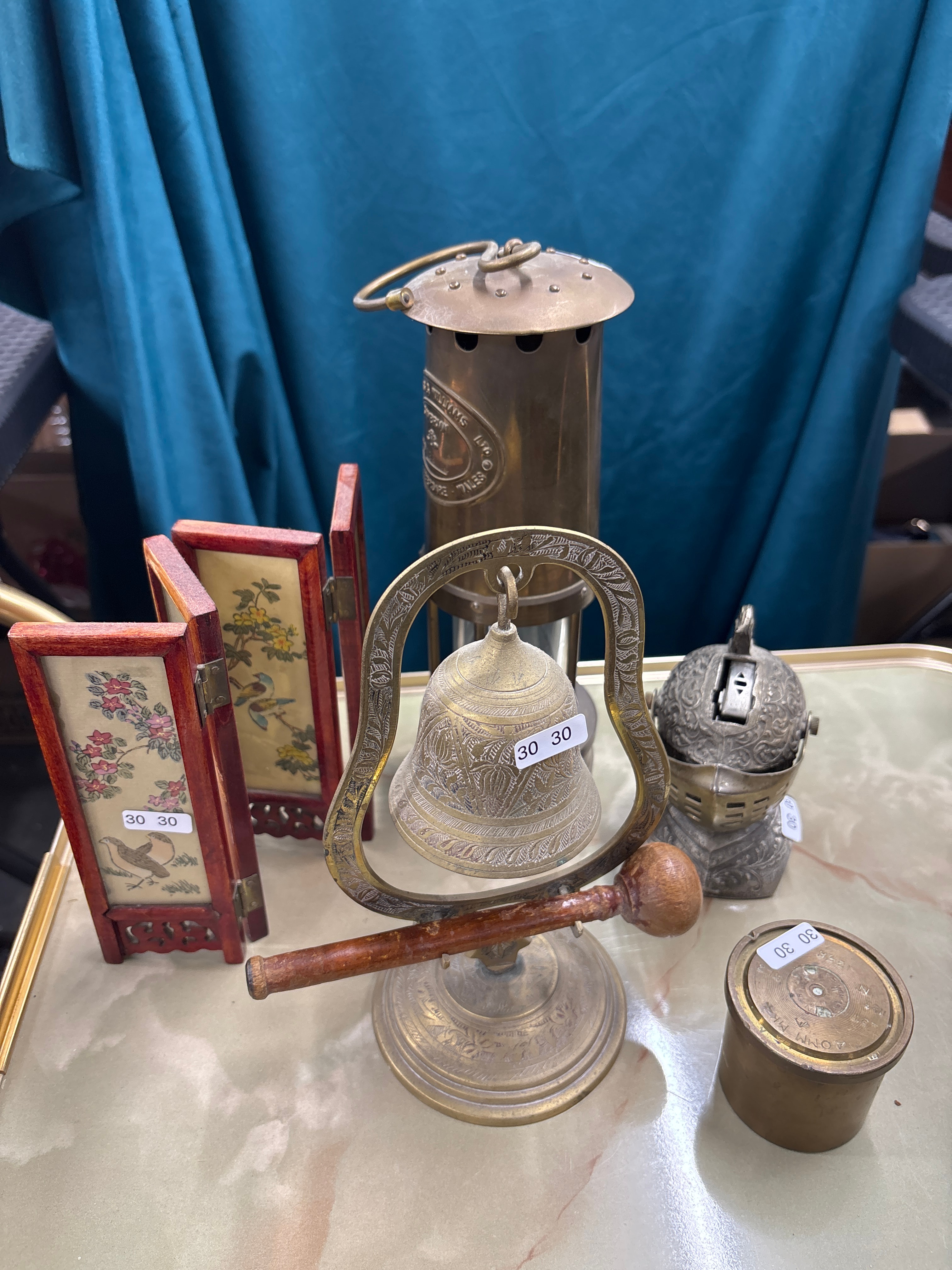 A Collection of Five Decorative Objects, including a Vintage Brass Gong Bell Etched Design Fish Stand with Wooden Mallet, Knight cigarette lighter