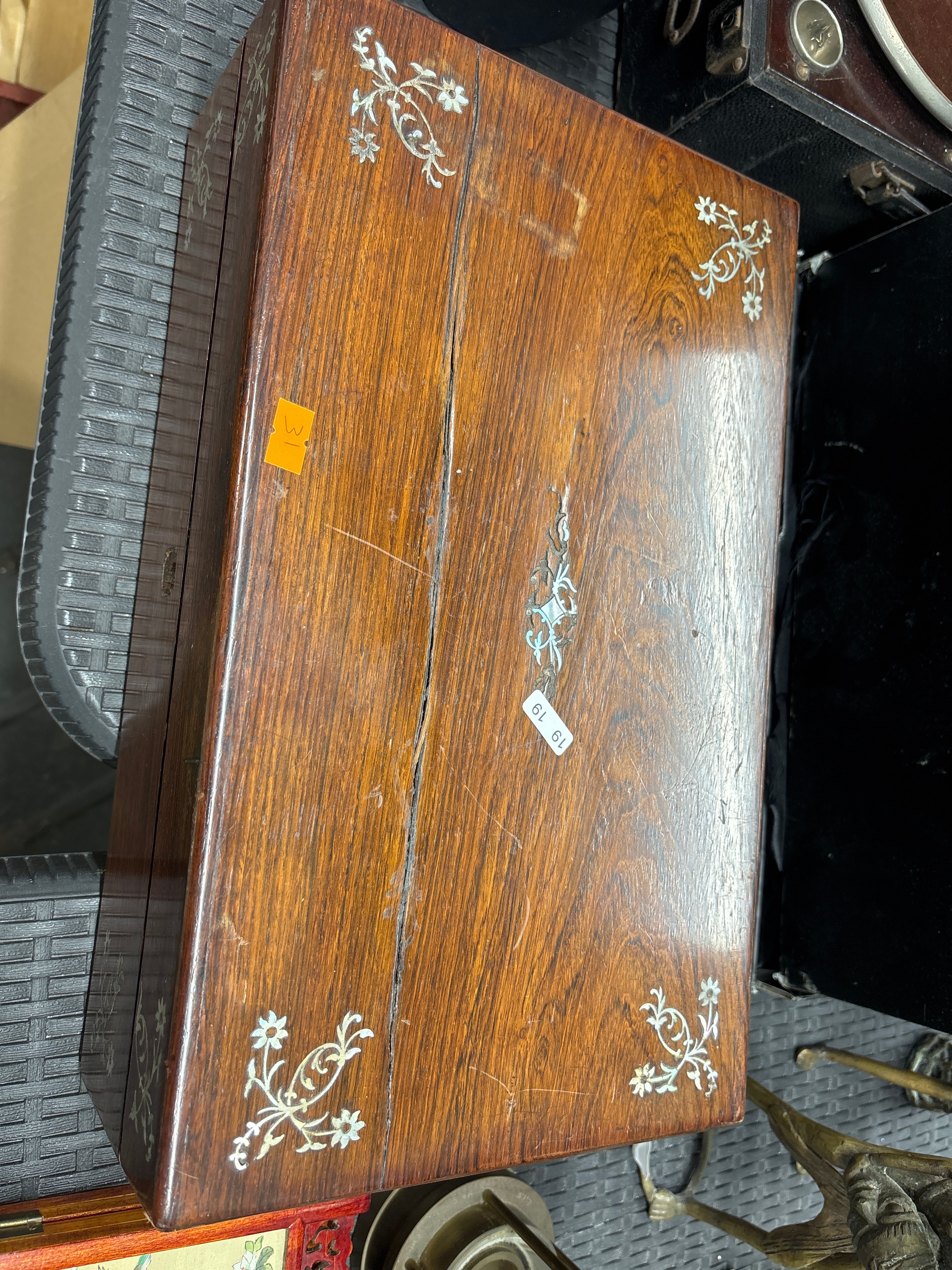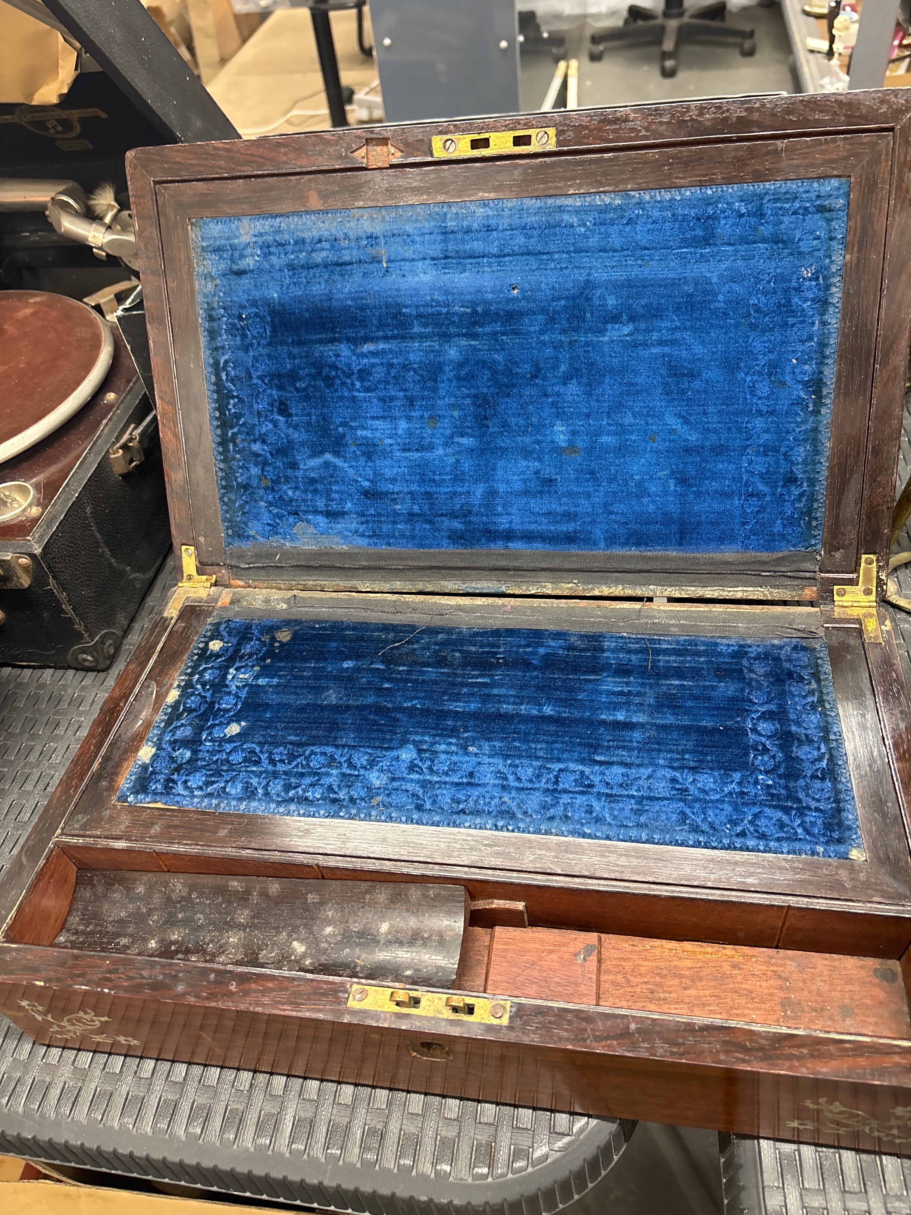 A Victorian rosewood box with mother-of-pearl inlay. Crafted from a dark reddish-brown hardwood with a prominent grain, its exterior is adorned with intricate mother-of-pearl inlay depicting floral and foliate motifs. The interior is lined with a heavily worn and discolored vibrant blue velvet or velour, featuring brass hinges and a lock plate. Internal compartments include a removable tray. This type of box is commonly associated with uses such as a writing desk, sewing box, or jewelry casket.