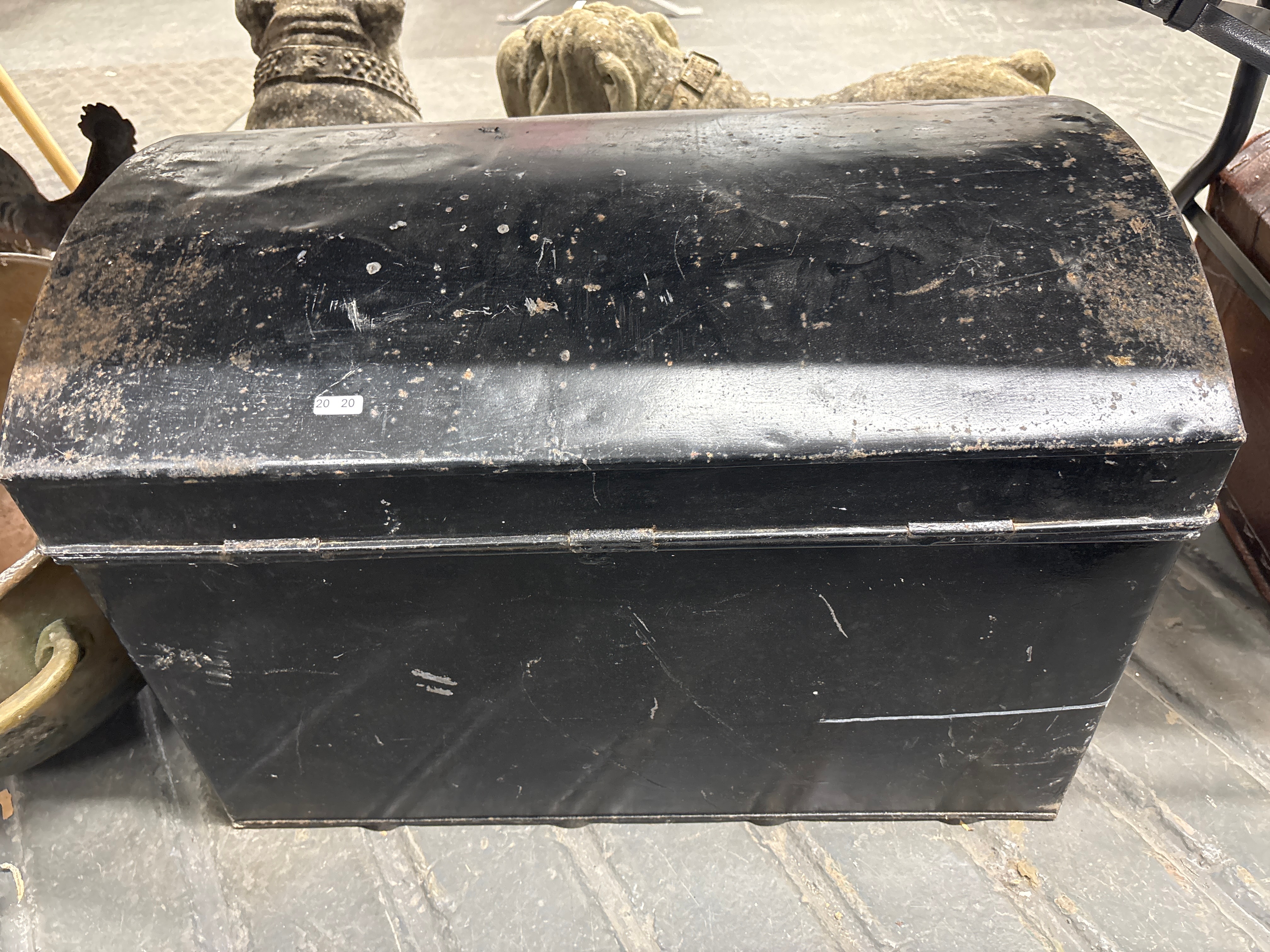 An early 20th century domed-top trunk, constructed from painted metal, likely steel or tin, with a matte black finish. A white rectangular label bearing the numbers “20 20” is present on the front left of the lid.