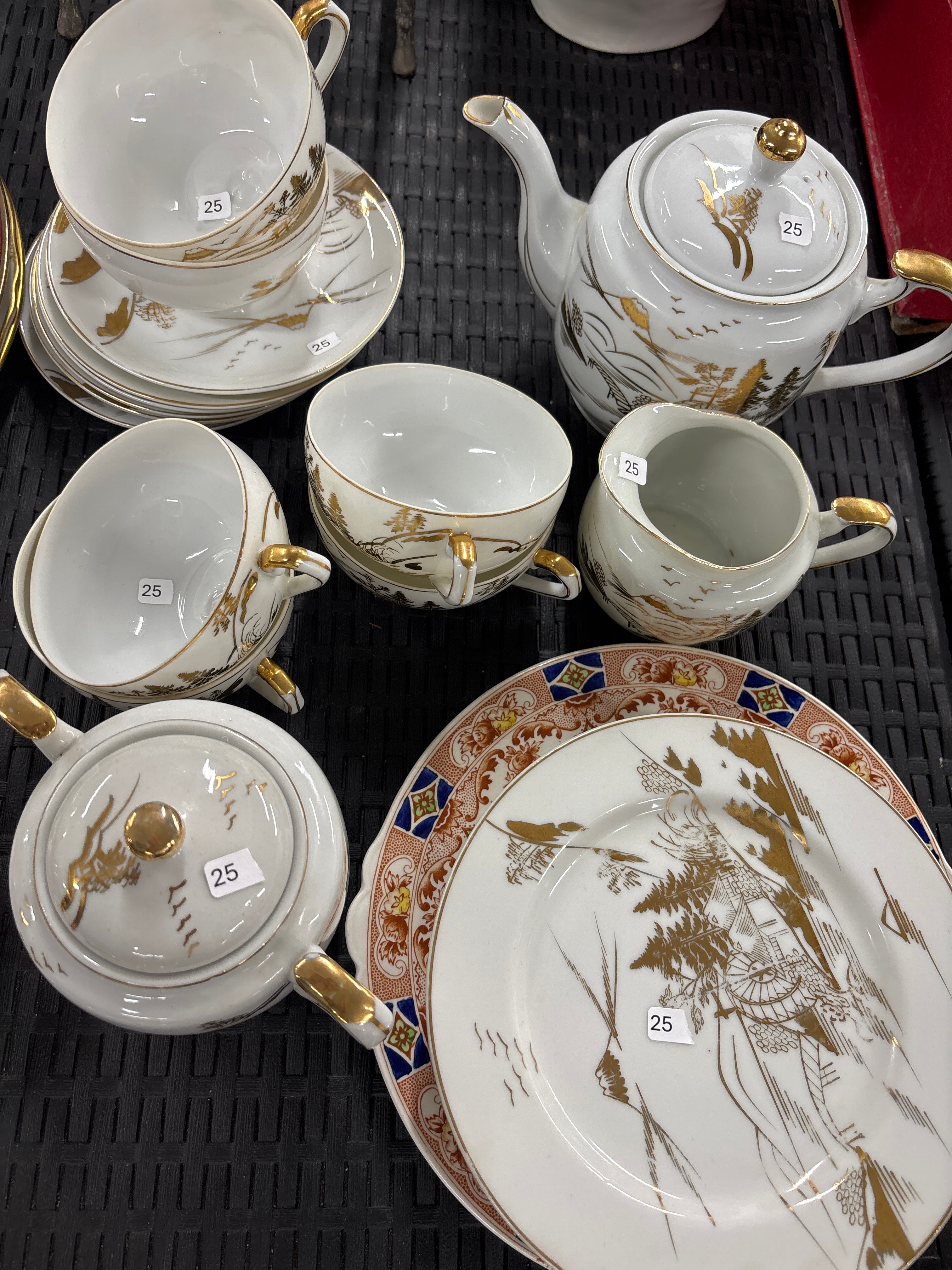 A collection of Japanese Kutani porcelain tableware, consisting of multiple handled teacups, matching saucers, a lidded teapot, a lidded sugar bowl, a creamer, and a larger dinner plate. The majority of the pieces are adorned with extensive gold gilt decoration featuring a landscape scene with trees, mountains, and flying birds, applied in a style suggestive of transferware, with all handles and finials also gilded. The prominent dinner plate, while sharing the central gilt landscape, features a distinct border decorated with geometric and floral patterns in blue, green, and brown. Small white stickers marked “25” are visible on several items.
