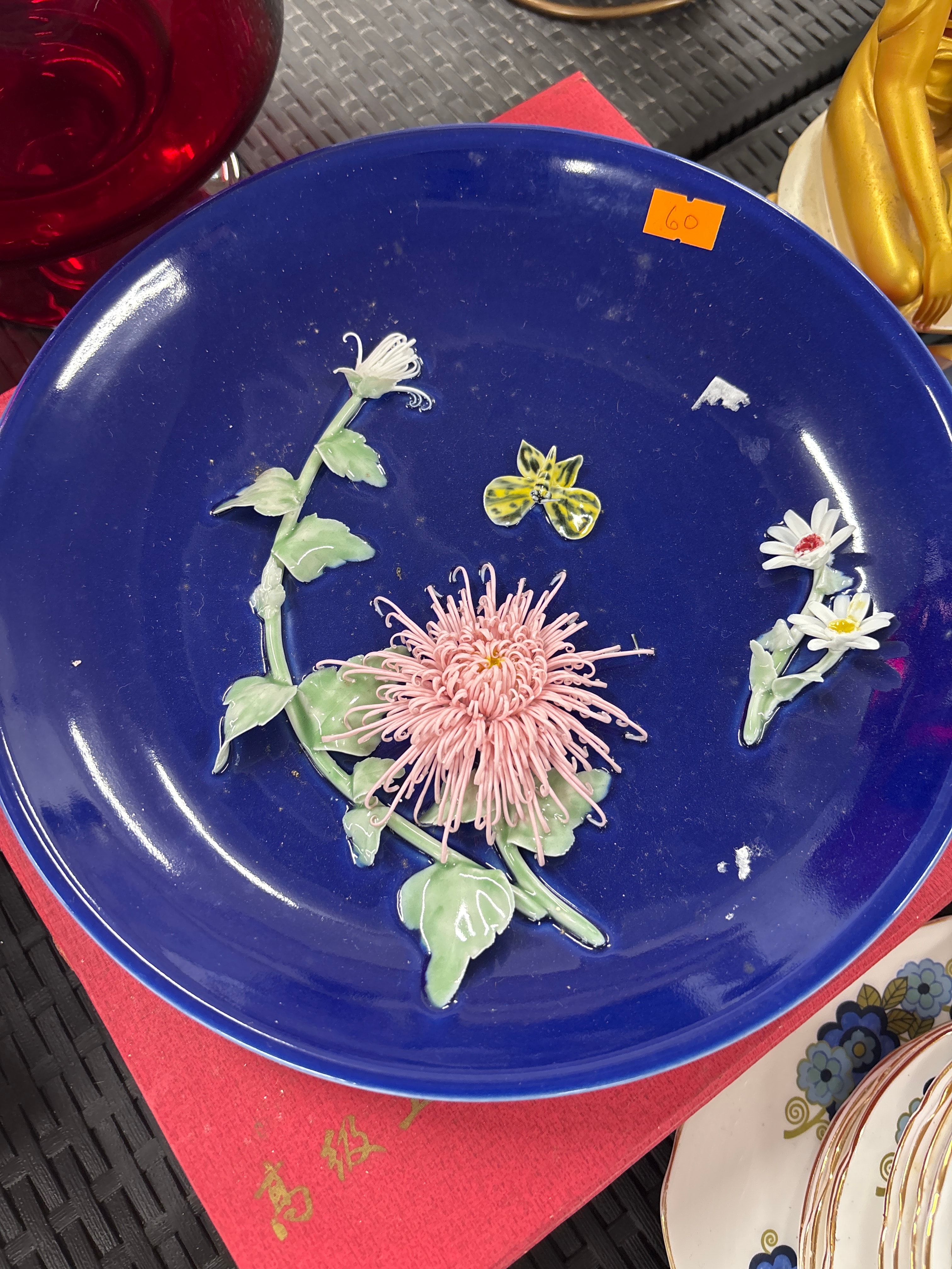 A large, circular, deep cobalt blue glazed porcelain decorative plate, identified as a Chinese PROC relief plate dating from approximately 1970-1990. The plate features an array of applied, three-dimensional sculptural elements depicting floral sprays. A prominent central pink chrysanthemum-like bloom with fine petals is accompanied by smaller white daisy-like flowers and a white tubular flower, all with green stems and leaves. A single yellow and black spotted insect is also affixed to the surface.