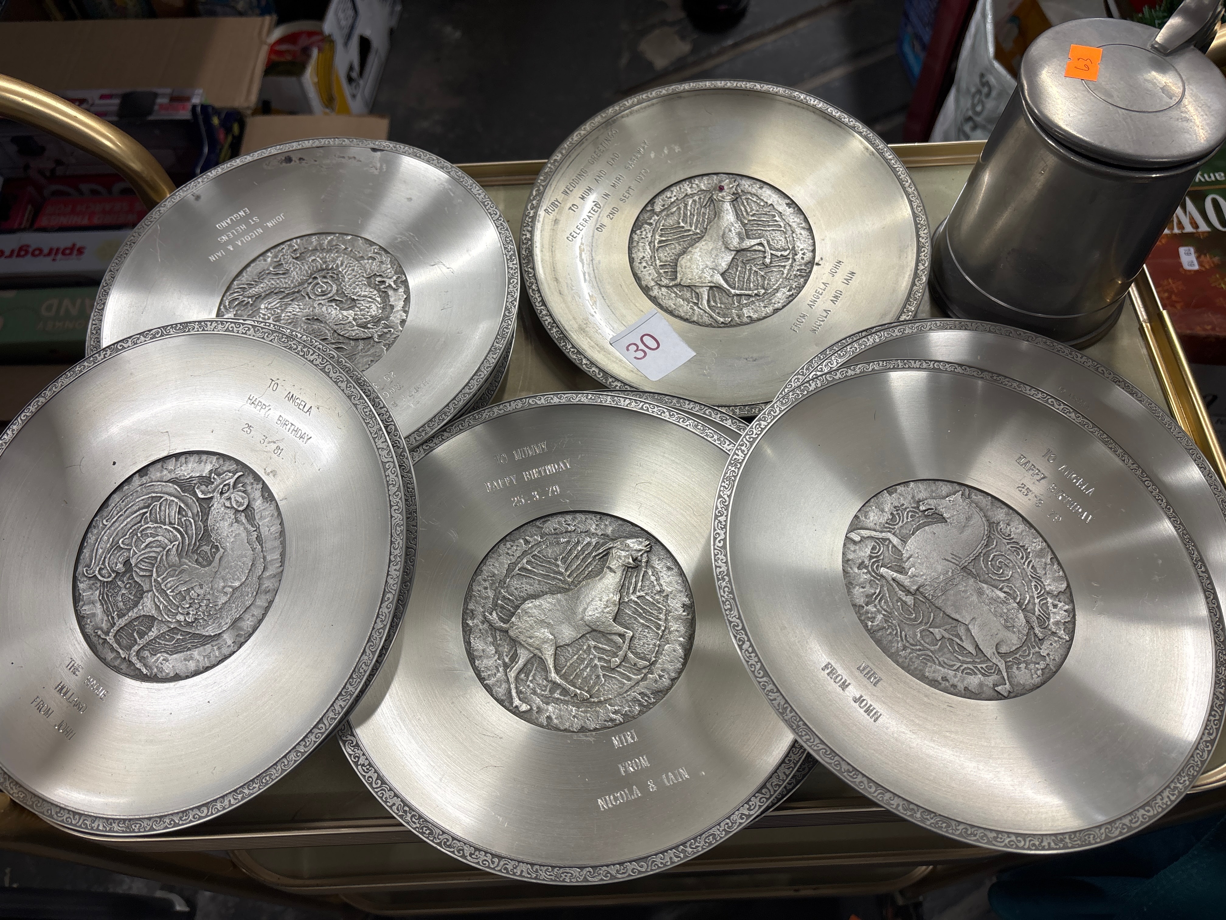 A Collection of Five Selangor Pewter Chinese Zodiac Plates and a Pewter Tankard