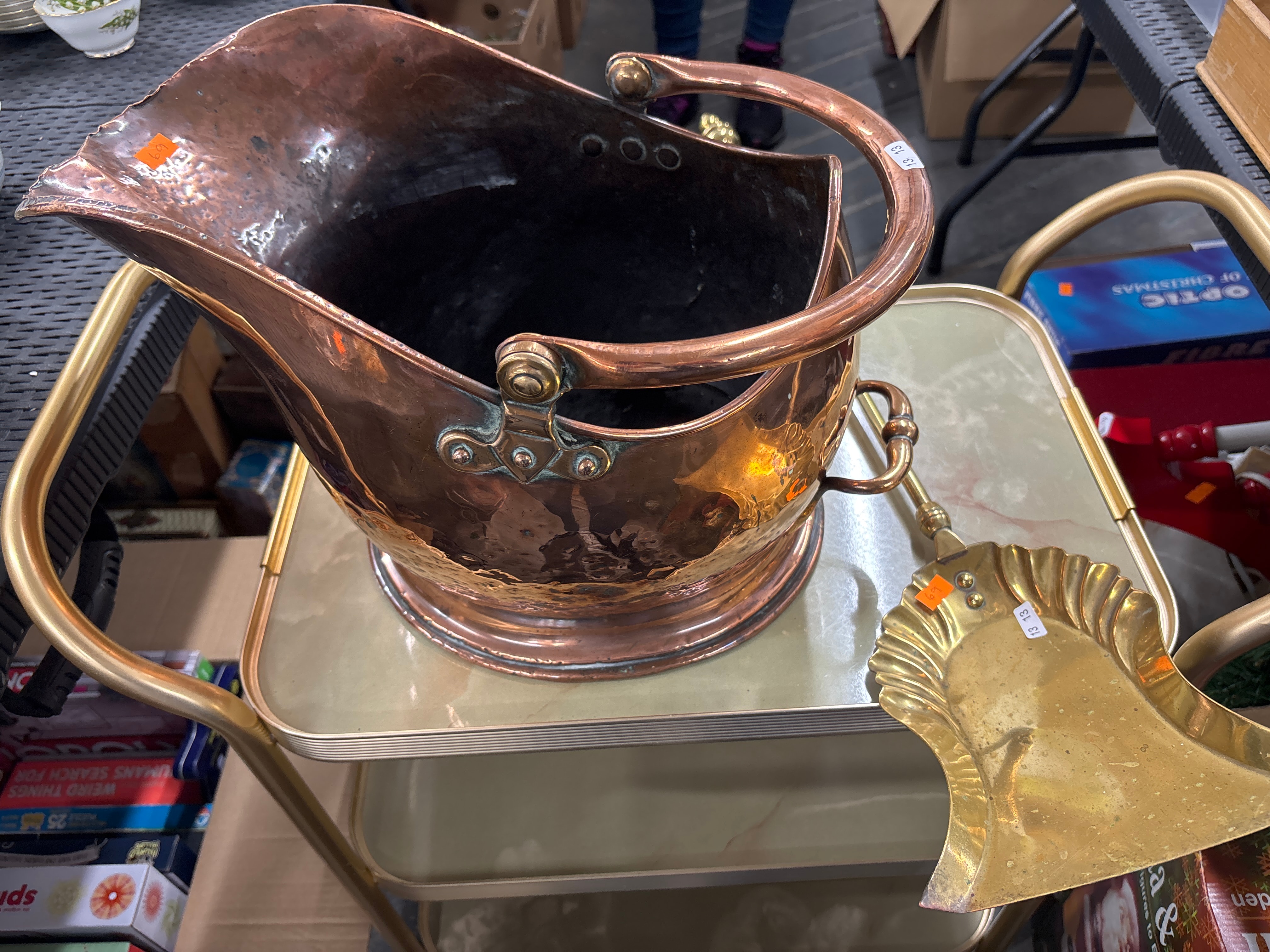 A Victorian English Copper Country House Coal Scuttle with Brass Scoop