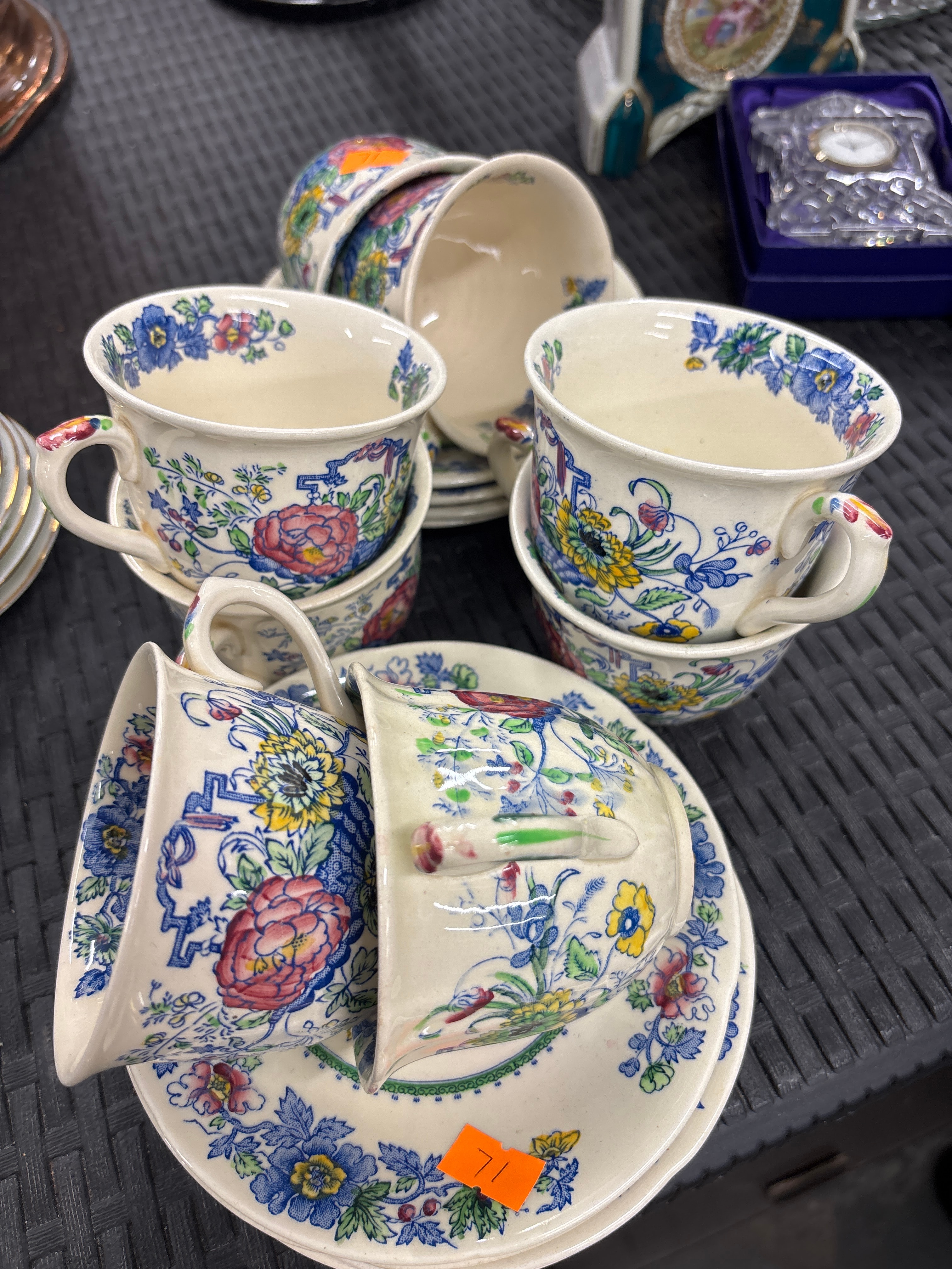 A set of five Mason’s Strathmore Blue ceramic teacups and six matching saucers. The off-white ceramic body is profusely decorated with a vibrant, traditional floral pattern. The polychrome decoration includes various flowers and foliage in shades of cobalt blue, rose pink, yellow, and green, often bordered by geometric blue designs. The handles are also accented with small colorful motifs. The style suggests vintage ceramicware.