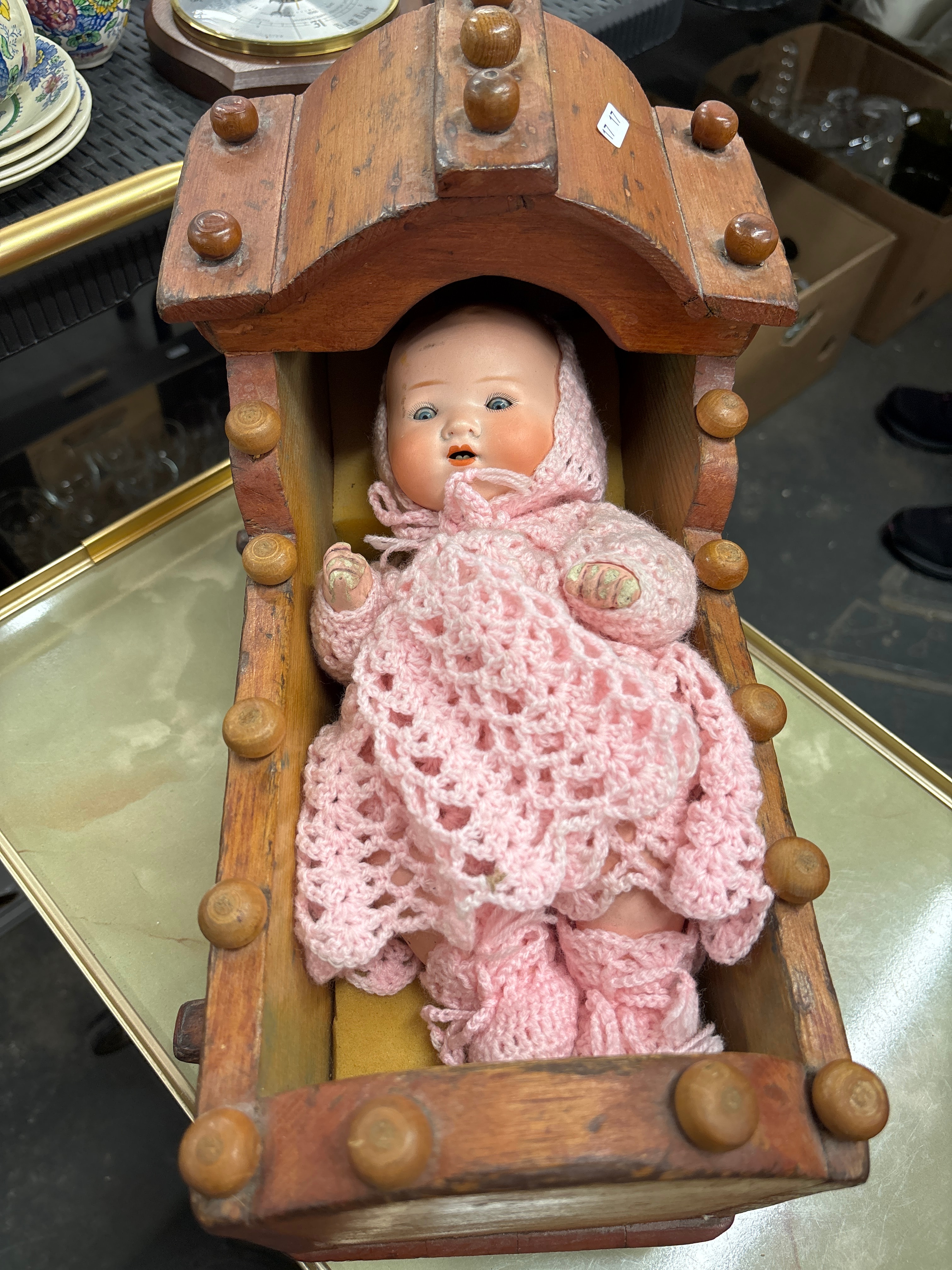 A vintage German-style baby doll, likely dating from the early to mid-20th century, presented within a rustic wooden doll’s cradle. The doll features a composition or early plastic head, hands, and lower legs with painted blue eyes, rosy cheeks, and an open red mouth. It is dressed in a complete ensemble of pink crocheted bonnet, dress, and booties. The wooden cradle, crafted from light brown wood, exhibits a rustic style with an arched canopy and decorative turned wooden knobs along the sides. A yellow/tan fabric lines the interior of the cradle.
