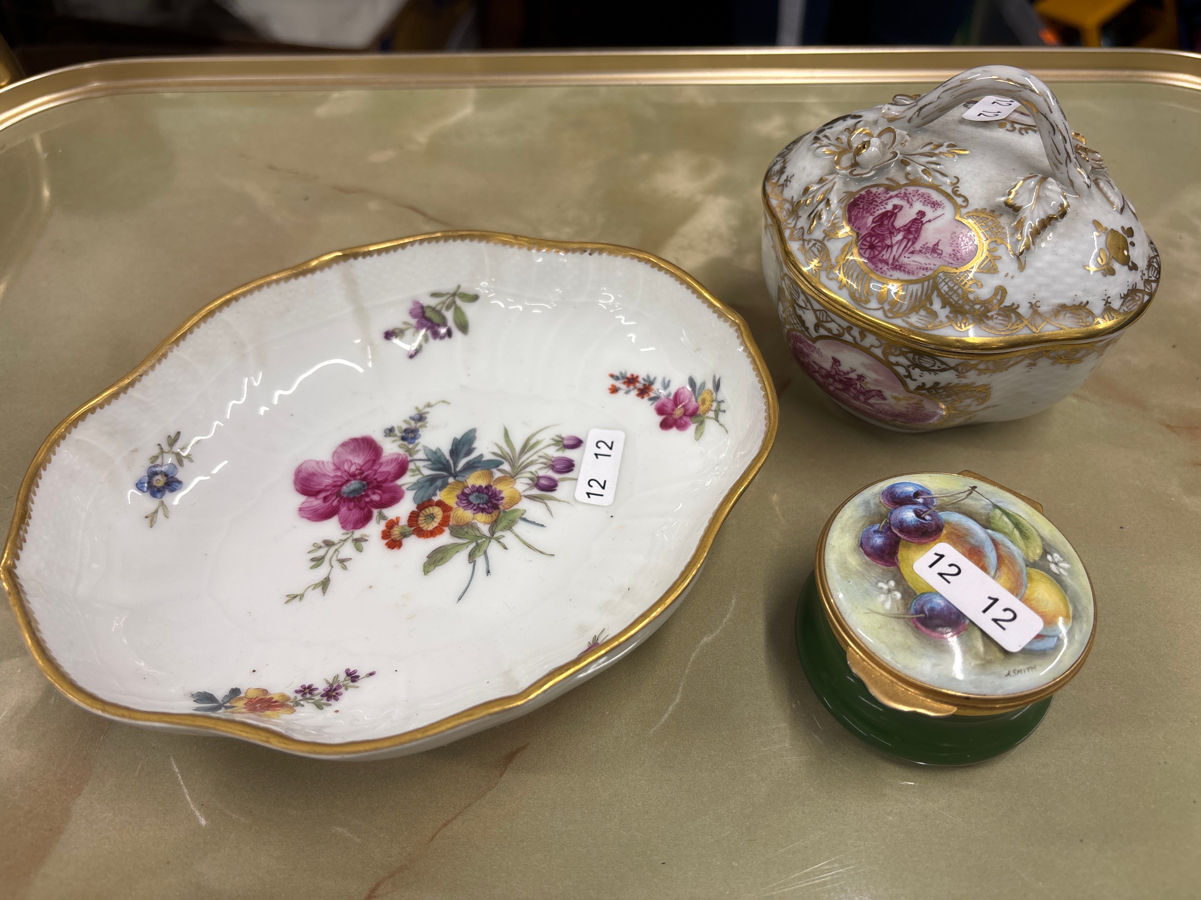 An antique KPM floral and gilt scalloped shallow serving bowl or platter, featuring a central polychrome floral bouquet and scattered smaller blossoms, with a gilt, finely patterned rim. Accompanying this is an ornate Rococo style lidded pot or bonbonnière, extensively decorated with gilt scrollwork and cartouches depicting figural scenes in magenta, complete with an applied floral finial and a loop handle. Also included is a small round lidded box with a dark green base and a gilded rim, featuring a hand-painted fruit still life on its lid, signed “J. Smith” in fine script. All three items bear identical white rectangular stickers with “12 12” handwritten in black, indicating an inventory or price number.