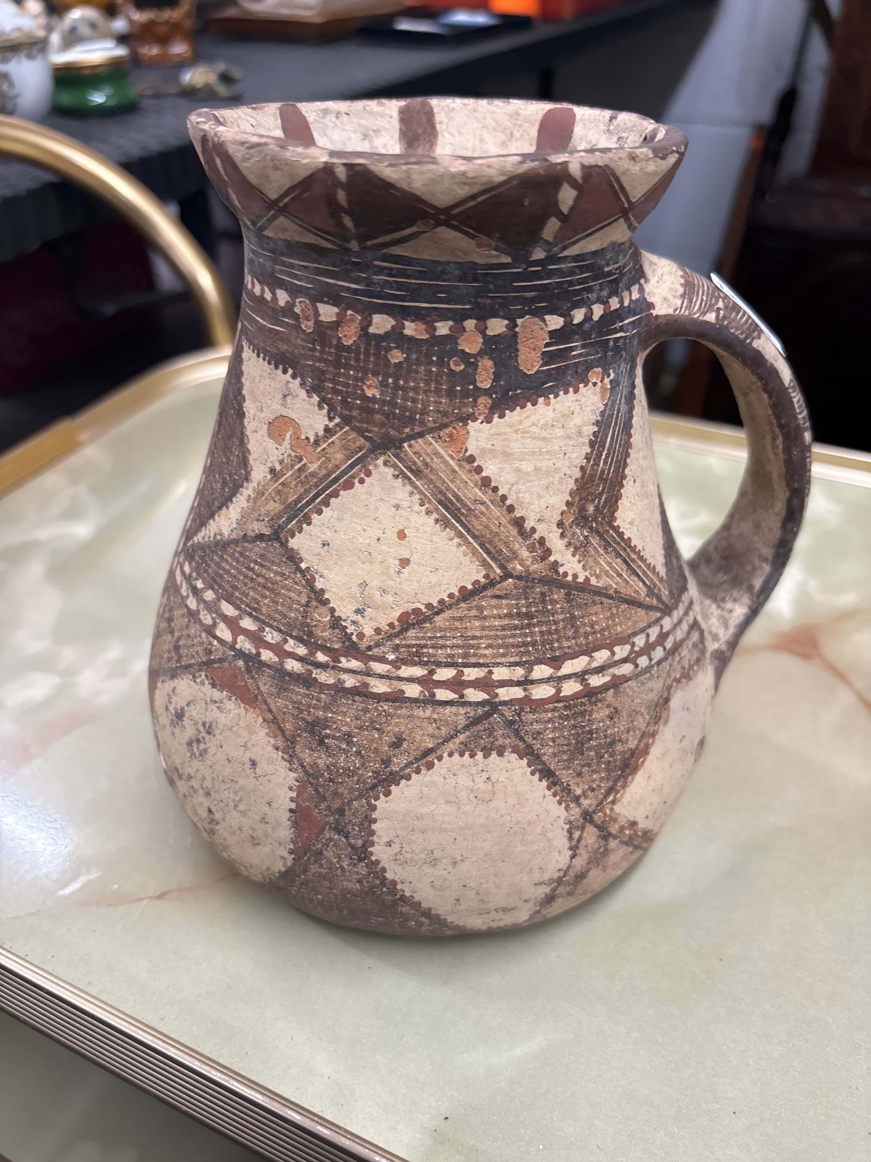 A Moroccan Berber earthenware jug, featuring a bulbous body, a single strap handle, and a slightly flared rim. The unglazed, light beige-colored ceramic body is extensively decorated with geometric patterns in dark brown/black and reddish-brown pigments. The decoration includes bands of cross-hatching, diamond motifs, dotted lines, and solid stylized shapes, imparting an archaic or tribal aesthetic.