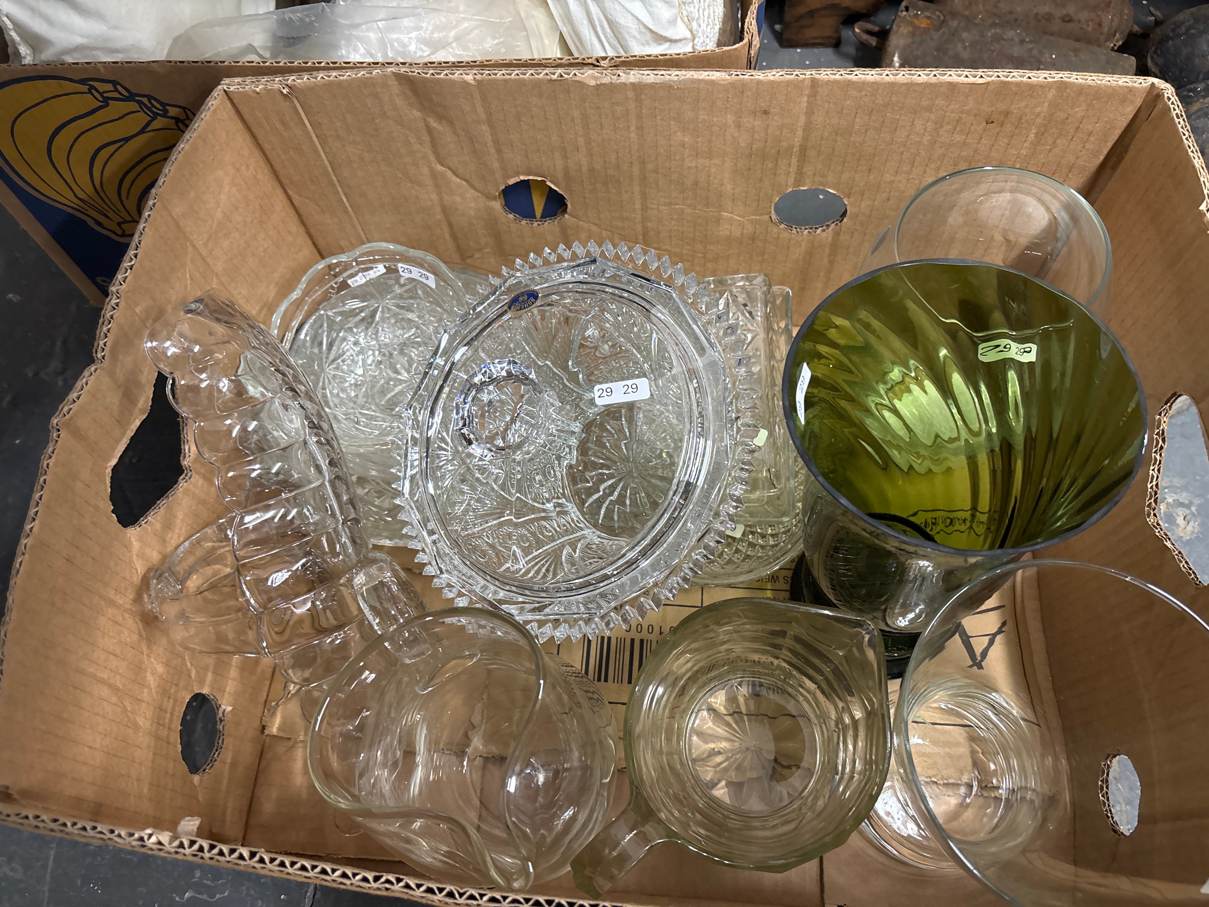 This cardboard box contains a mixed lot of approximately ten glass items. The collection primarily features clear pressed or cut glass pieces, including various bowls and dishes adorned with intricate geometric and starburst patterns, alongside a larger fluted compote or serving bowl, several pitchers or creamers, and tumblers. A notable contrasting piece is an olive-green glass vase or large tumbler with vertical fluting. Multiple items bear white rectangular stickers displaying the numbers “29 29,” and one patterned clear glass piece has a small, indistinct blue label. A modern metal ring is also present among the glass items.