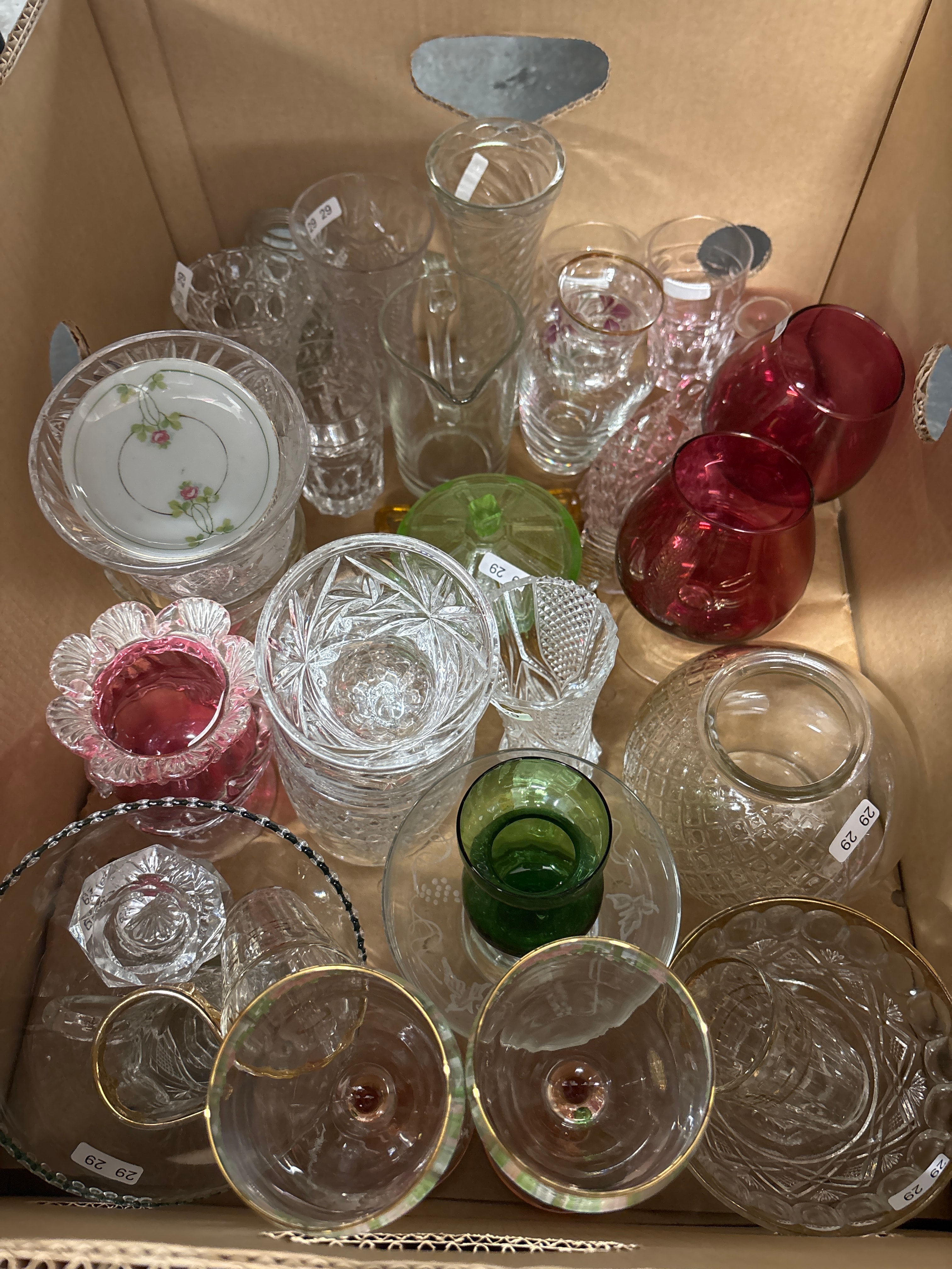 A varied assortment of glassware, predominantly clear, featuring numerous drinking glasses, tumblers, small pitchers, vases, and dishes. Many pieces display pressed or cut patterns, including geometric designs, diamond motifs, fluting, and starbursts. The collection also includes several colored glass items: deep red/cranberry glasses, a green goblet with a matching plate, a lime green domed dish, and a pinkish-red fluted dish. Completing the lot is one small white ceramic or porcelain saucer, hand-painted with pink roses and green foliage encircled by a double line. Visible white stickers on multiple items bear the numerical marking “29” or “29 29”.