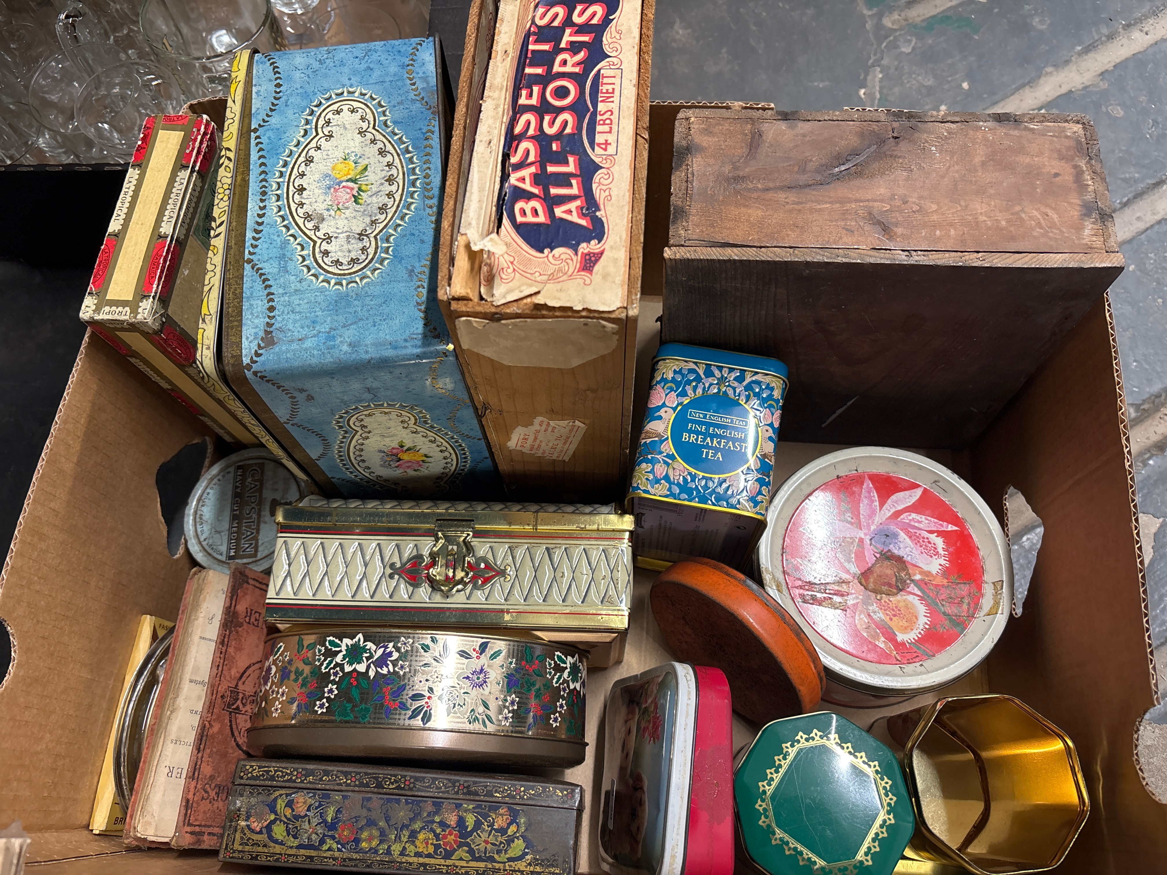 A collection of miscellaneous storage containers, predominantly comprising vintage advertising and decorative metal tins, alongside a rustic wooden box and several books. The lot includes various shaped tins (rectangular, oval, round, octagonal) made of metal, a paper-covered confectionery box, and a wooden cigar box. Specific items identified include a large “BASSETT’S ALL-SORTS 4 LBS. NETT” box, a “NEW ENGLISH TEAS FINE ENGLISH BREAKFAST TEA” tin with bird and floral motifs, a “CAPSTAN NAVY CUT MEDIUM” tobacco tin by “W.D. & H.O. WILLS BRISTOL & LONDON,” and a “LA TROPICAL JAMAICA” cigar box. Other tins feature diverse decorative styles, such as a blue tin with a central floral cartouche, an oval tin with vibrant floral patterns, and several with geometric or ornate accents.