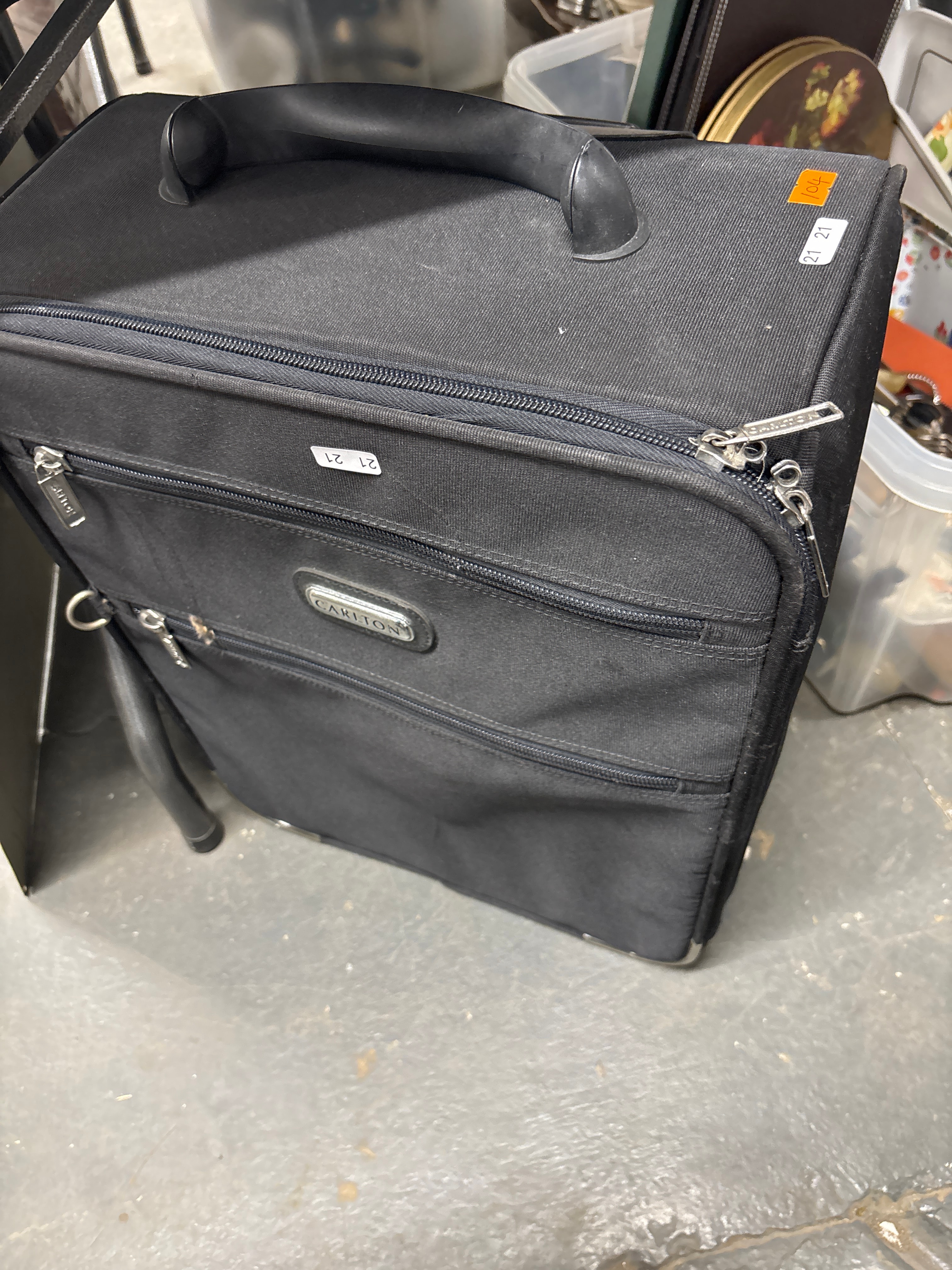 A Carlton black soft-sided upright suitcase. Constructed primarily from a dark fabric, likely nylon or a similar synthetic textile, with black plastic/rubber trim on the handle and silver-tone metal zippers. A prominent silver-toned emblem on the front pocket clearly displays the brand name ‘CARLTON,’ which is also visible on some zipper pulls. The item features multiple zippered compartments and a top carry handle. The design suggests it is an expandable, wheeled model, consistent with similar luggage types. White stickers on the side pocket and top read ’21 21,’ while an orange sticker on the top shows ‘104.’