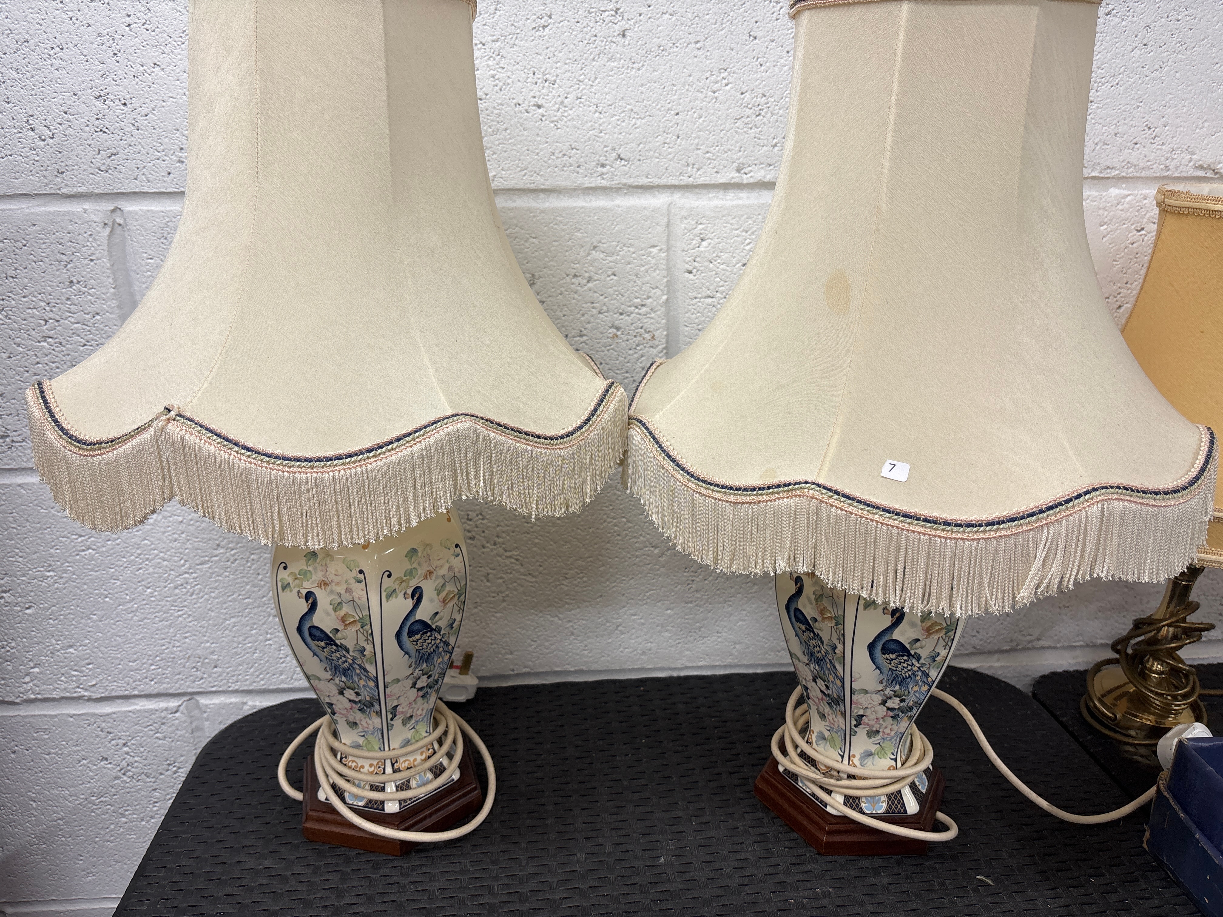 A pair of decorative table lamps, each featuring a ceramic base in an Asian-inspired Chinoiserie style. The bases depict peacocks among flowering branches in blue, pink, and green hues, and are set upon dark stained hexagonal wooden plinths. Each lamp is topped with a cream-colored, bell-shaped fabric shade, trimmed with multi-colored braided piping and a matching fringe. White electrical cords are coiled around the base of each lamp.