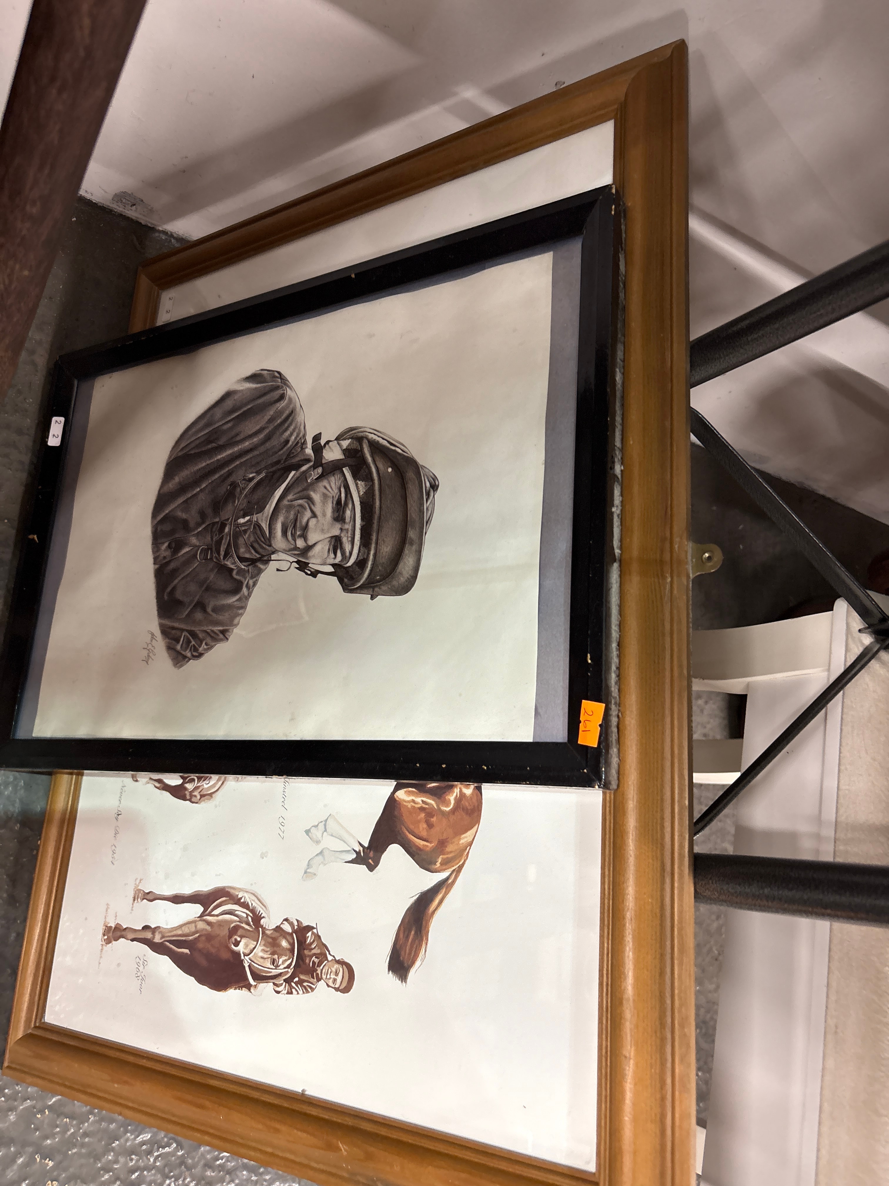 A pair of framed artworks featuring equestrian subjects. The upper artwork is a monochrome drawing or print, depicting a head-and-shoulders portrait of a jockey in a helmet. A cursive signature, possibly “John E. Blayton,” is visible on the left side of the artwork. It is presented in a black frame with a narrow light-colored mat. Stickers marked “2 2” and “261” are affixed to the frame. The lower artwork is a color print or illustration, featuring a brown horse with white stockings and a jockey. Visible text on this print includes “Norse Way Dec 1962,” “Sir Ivor 1968,” and “…Howard 1977.” This piece is encased in a simple light-toned wooden frame.