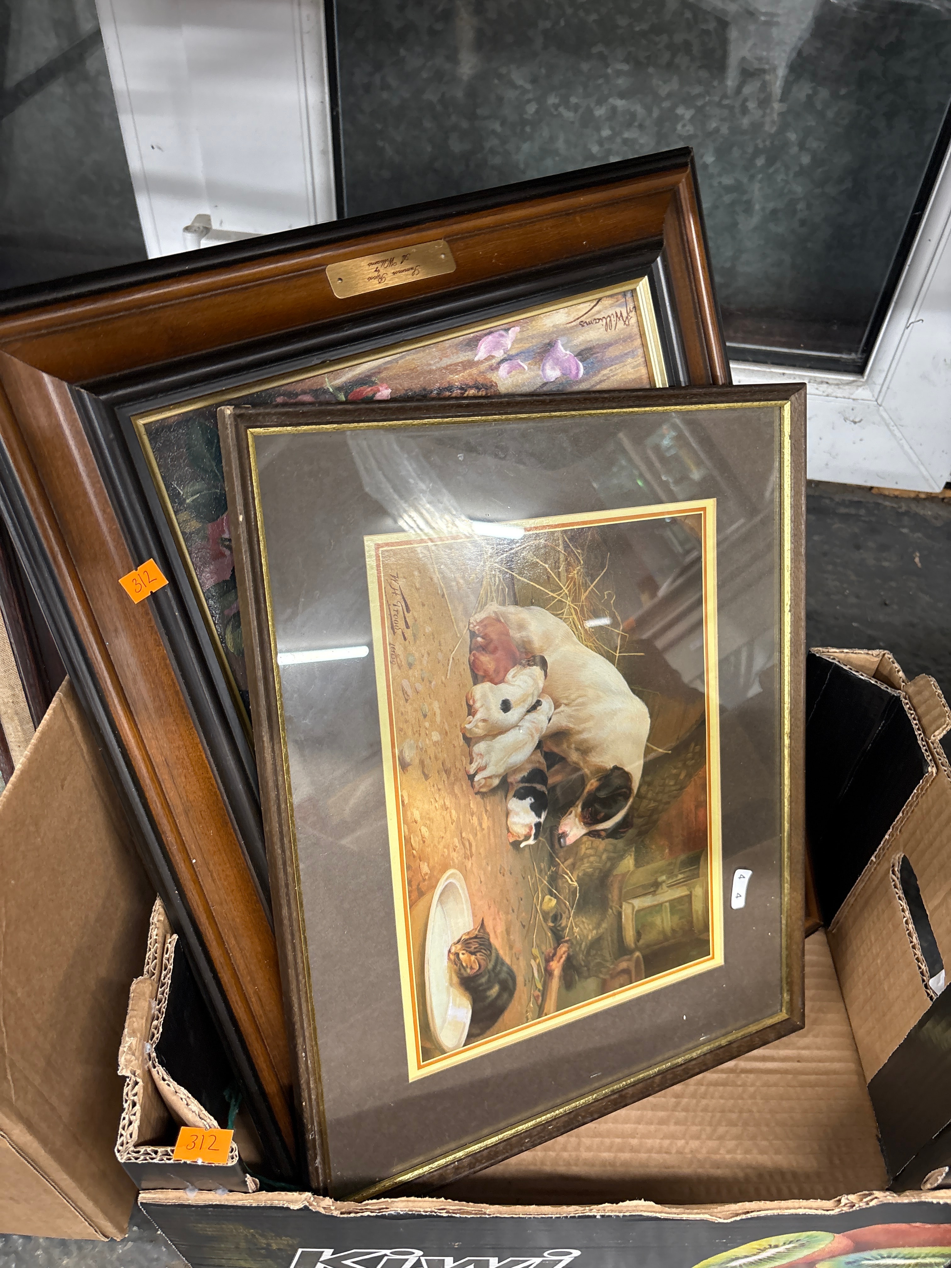 The first, a print depicting a mother dog nursing several puppies alongside a small tabby kitten near a feeding bowl, signed vertically on its left margin ‘W. H. Trood’. Presented within a dark matte, a thin gold inner border, and a brown wooden frame. A small white sticker marked ‘4’ is visible on the right side of this frame.